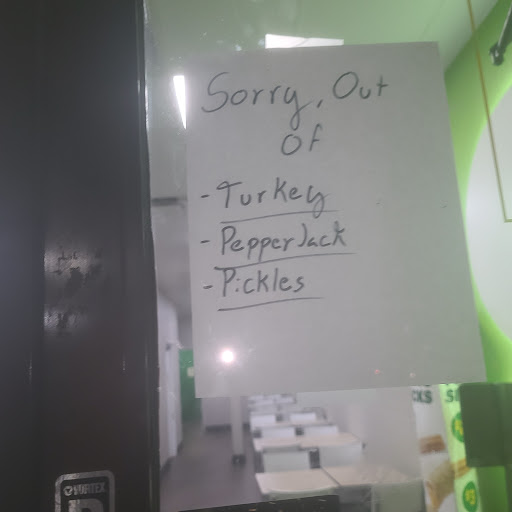I came over here to visit my mother in law who lives near and wanted to pick us up a sandwich. First I walked up to the door and saw a sign hand written Sorry we are out of Turkey, pepper jack cheese and pickles. REALLY? I decided to still go in WHY ? I have NO good reason. I wanted to order my mother in law a turkey OBVIOUSLY that's Not going to happen. I decided a ham American cheese and what vegetables they had. Honestly the lettuce looked bad NOT FRESH , tomatoes looked shriveled up like they have been previously Frozen and the counter was a mess. I go to make my sandwich I wanted a foot long veggie (1st meal all day) ask for American cheese and was told oh sorry we just ran out! GUESS my mother in laws 6 inch took ALL the American cheese NICE!! I said don't worry with mine your out of way to much. He said I can do shredded cheese No THANK YOU. I PAID for the one sandwich and left. This is BEYOND RIDICULOUS.!! SubWay commercials say FRESH yeah OK NOT THIS LOCATION !!! THEN they don't even have all the cheese or vegetables REALLY VERY VERY SAD AND DISAPPOINTED!!!! WON'T BE BACK TO THIS LOCATION!!! IF I could I would give NO STARS! THAT'S WHAT...