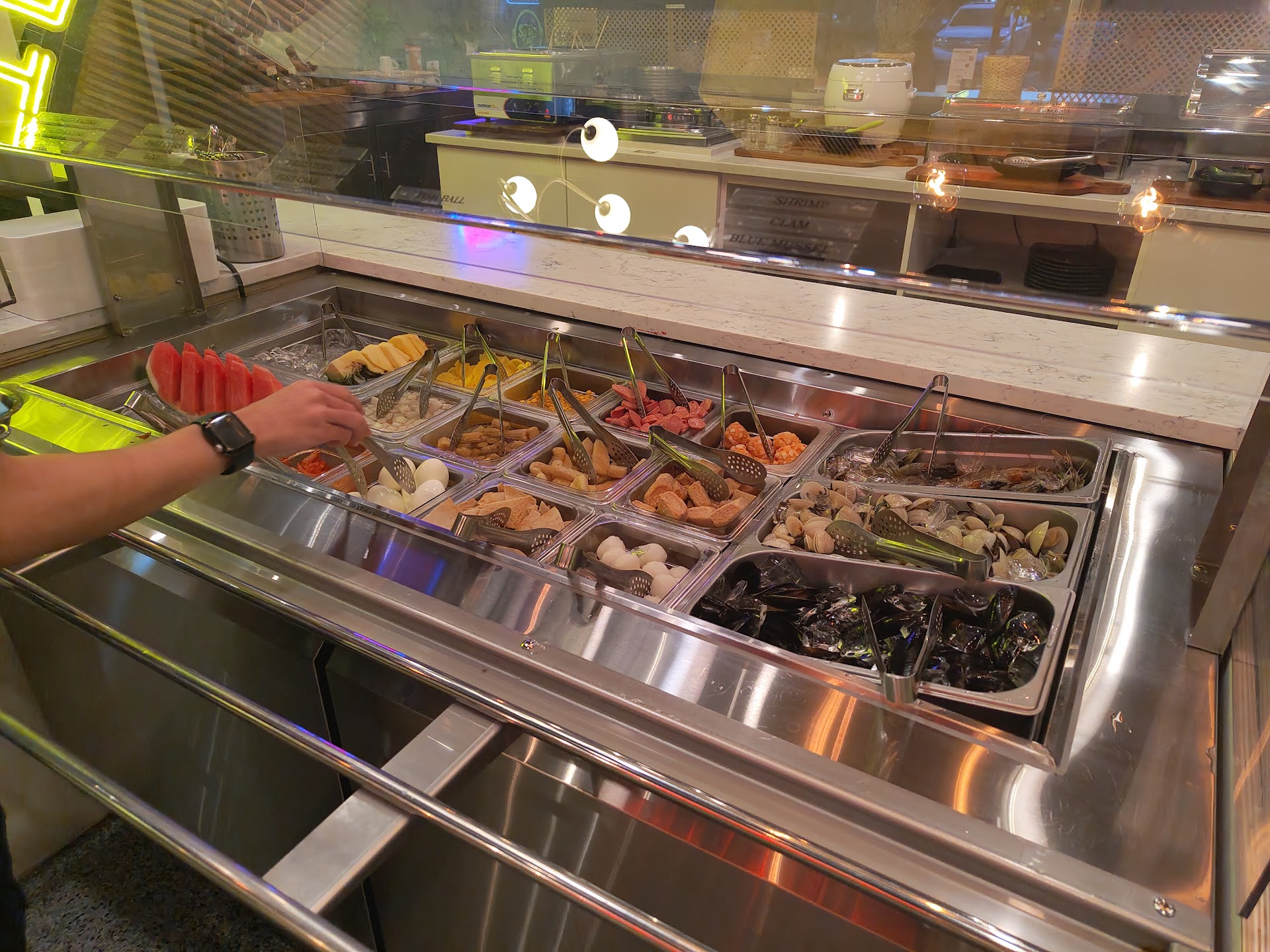 We tried a little bit of everything, but definitely ask the waiter of how it all works because it is daunting the first time you see it all. You can create your own ramen from their ramen bar, then build a "sweet pot" mix of your own choices you grab from the main bar(vegetables, meats, tteokbokki). From there, the waiter will take it back and prepare your dish with your choice of sauce/soup.