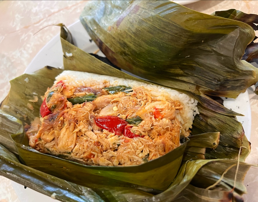 Nasi Bakar chicken - spicy chicken with plain rice wrapped inside the banana leaves and grilled. The juice of the spicy chicken soaks up the rice, and the scent of grilled banana leaves added up in a unique flavor combination, which makes this dish authentic and delicious.