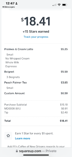 Read moreI recently visited PJ's Coffee in Camp Springs for the first time, and unfortunately, the experience fell short. While the barista was pleasant and patient, the coffee I ordered was served at a lukewarm temperature, which was disappointing. I also ordered beignets, which were tasty at best but not remarkable. Additionally, the Peach Palmer tea I ordered tasted weak, with barely any peach flavor coming through.