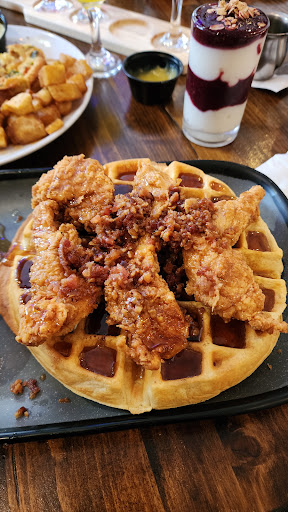 We were seated and instantly greated by Shannon (apologize if not spelled right) who was such a pleasure to talk to the entire meal. She helped us select a tasty memosa flight and had us try a Apple Momosa and it was probably our favorite one but they were all sooo tasty. We shared the Chicken & Waffles and something called a quiche which came with some tasty fried potatoes and some kind of spinach strawberry salad which was also tasty. There wasn't one bite that tasted off. We also got to try their raspberry parfait that I personally destroyed.