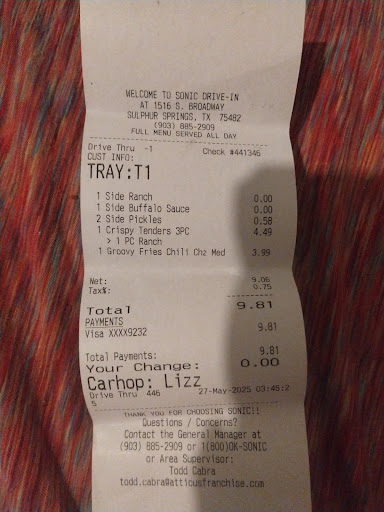 Read moreUnfortunately the service wasn't good. And the food was hot but it wasn't good either maybe the service put a bad taste in my mouth.. or I don't like Sonic 🤷🏿♀️. First I called because i tried to order online and it said it wasn't available so I called to make sure the place was open. The employee said it was open. that was at 3:23. I arrived at 3:27. the lady said she can't take any.orders she's on break for 10 more minutes... I waited the 10 minutes. Mind you the lady seems aggressive and I'm not sure why maybe because it's 3am and she tired idk. But I was polite anyway because she wasn't ruining my night. I had an order online it says I can order 5 sauces for free.. so I gave her the same thing that I ordered online and they told me they can't do the wraps only Fried things. So I changed my order I was really trying to be positive because it seems the associate was in a bad mood .. she tells me that if I want more than one sauce I have to pay for it. I informed her what it says to the app and she says she can't do that.. and has to charge me . on the receipt she charged me for pickles because the sauce came up as free... if the system is giving them too me as fee why go out of your way to charge me? Lady was just rude in her responses and had no customer service skills. I hope she gets that together. I felt bad because I know I'd be annoyed serving food at 3 a.m. but customer service is your job so that's what you...
