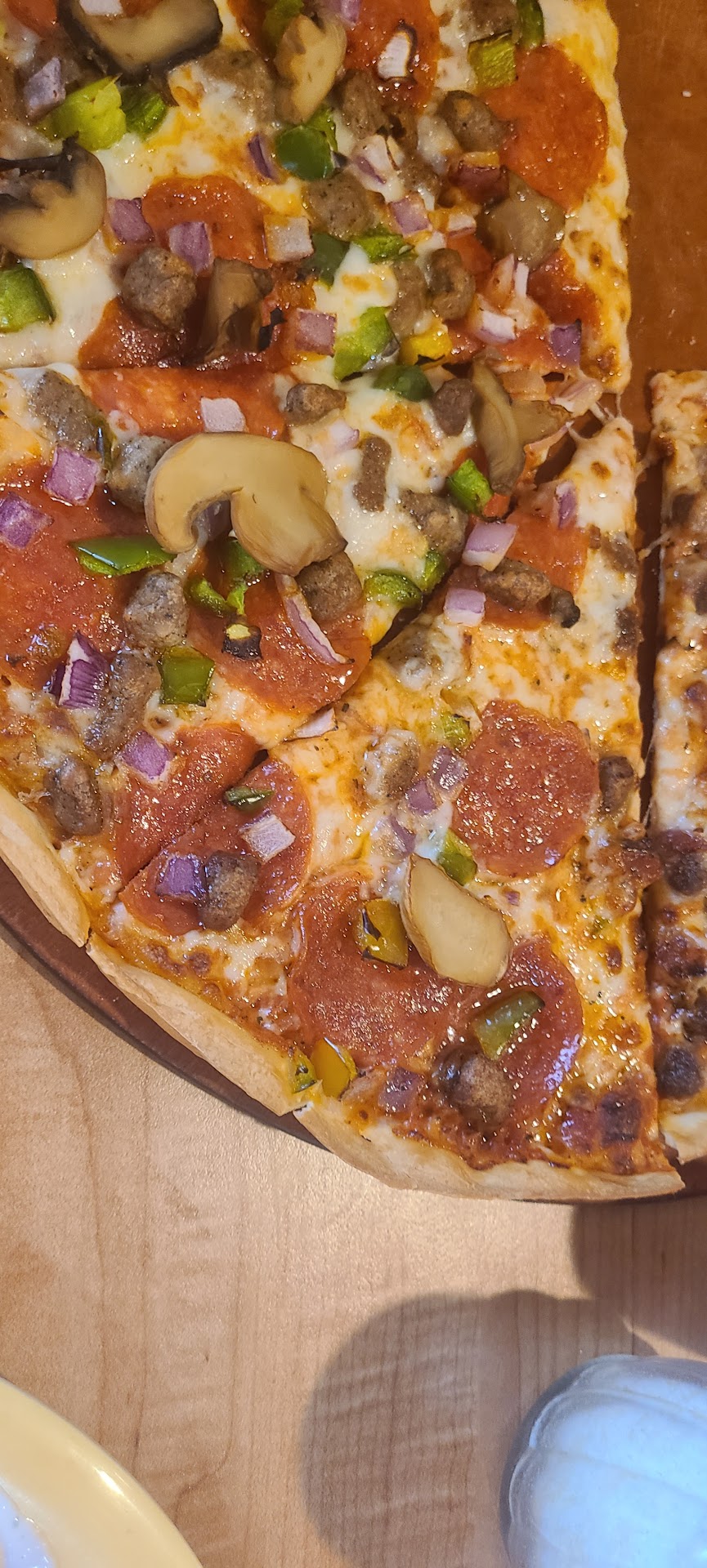 The place was clean including bathroom. The manager on duty was exceptionally good. She tried her best to see my family & I enjoyed our meal. Sorry to say the food was lacking, had no flavor. I'm not sure if the cooks just couldn't keep up with all the orders from pick-up & the drive-thur. We ate inside because we had alot to feed. We sent our pizza's back because it was over cooked ( like burnt all over). Shoulda taken a pic but I was thinking more about my family. Just hoping they'd get half full. The Calzone was so over cooked the inside filling looked more like they used tomato paste instead of the pasta sauce The cheesy bread with ranch & marinara sauce was the most decent. So when they offered us a couple new pizzas. The kids & adults ask for more cheesy bread & sauces. Here's to good. I & a couple others enjoyed the nice & very fresh salad bar. Plus the manger did deducted some from our final bill. Our waiter was very attentive & he deserved his tip. Bless his heart he really went out of his way to make sure our table was clean from used plates. He refilled our drinks. I give 3 stars only because of how these 2 employees went above & beyond. After Covid is completely over We'll it give it another try in hopes that the food will improve. The service was good not the Pizza...