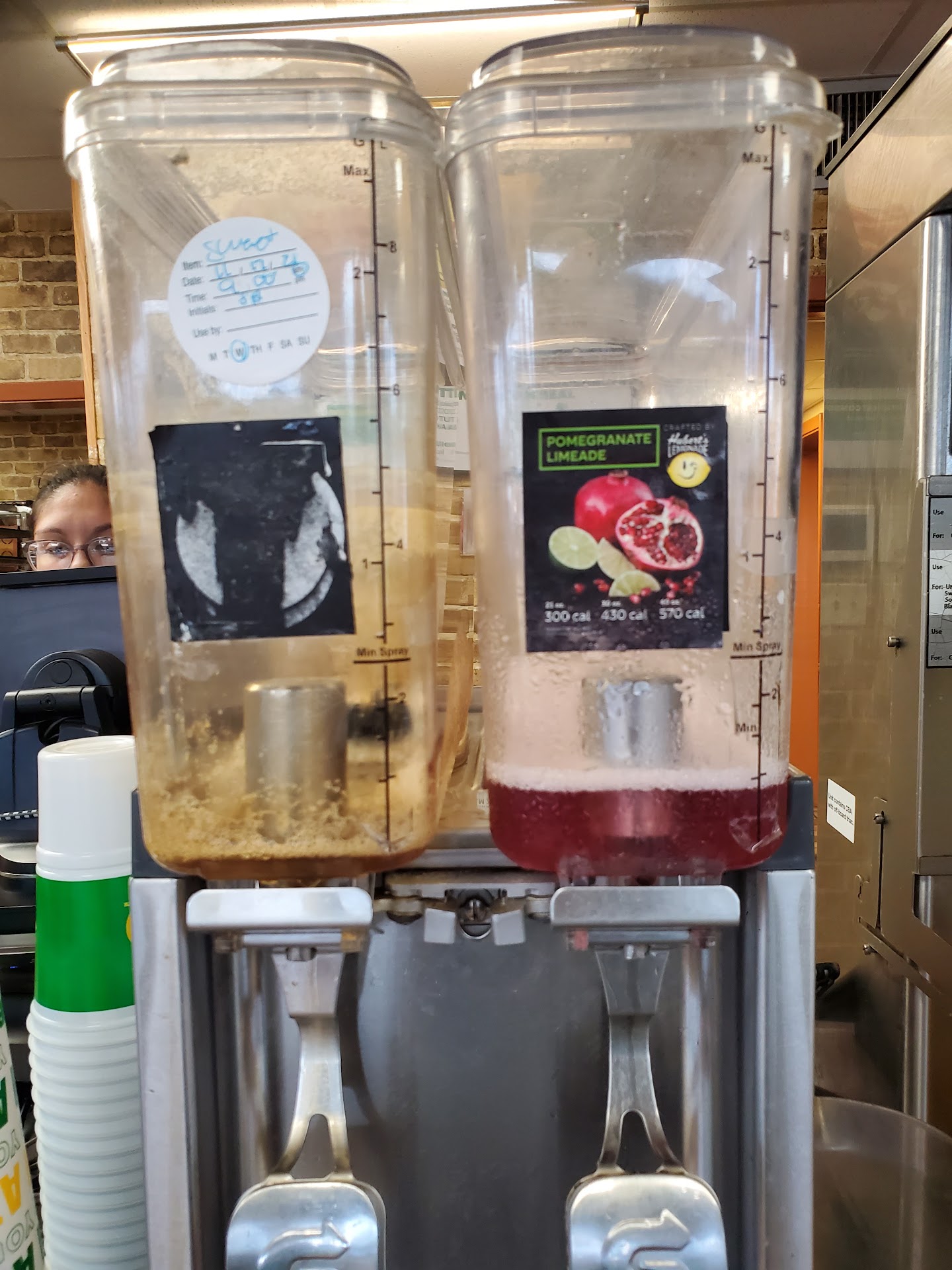 Read moreThe pictures are from Thursday afternoon whereas the tea was made more than 24 hours before. 1 tea-bin was completely empty and crusty. also the staff was rude yelled at me that they would not serve a premade egg white after 11 it was too hard. like its pre-made you literally just pop it in the microwave like you do every other bit of meat every time and she yelled at me again stating it was after 11 and they refused to serve eggs. The place was disgusting the staff was rude and I'm so glad I don't live in this town where are the restaurants...