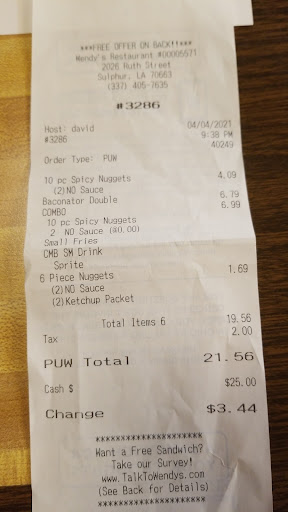 Read moreVery poor attention to detail. I placed my order, pulled up to the window and the attendant took way longer than expected before she called out the wrong price because she had my order wrong. Another attendant tried to help and I thought they got it together. I was handed my order, paid for it and drove off. When I finally opened my order, it was not what I ordered. I should have asked the attendant to repeat my order instead of thinking that the discussion that they were having was good enough. Never did the attendant ask me what I ordered to verify their conversation and it was my mistake to think they could do their job properly. This single experience will cause me not to eat at this location ever again. I do not like eating fast food but if I am in a position where I have little choice, I do not want to experience something like this ever again. I have worked fast food before when I was young, when technology wasn't what it is today and I know that it is not that hard to do that job. Wendy's needs to train their front line of representation of their brand. Do...