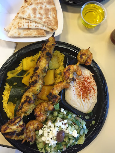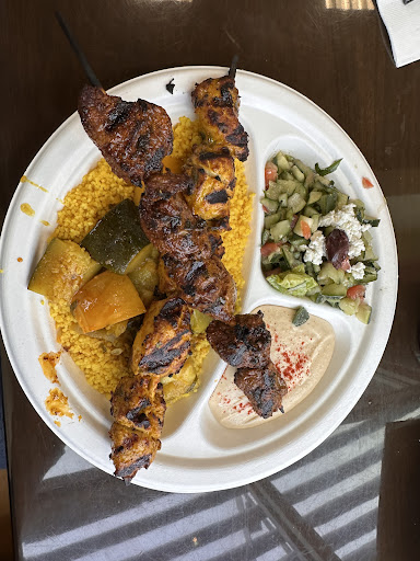 If you're looking for healthy eats, this is your place. Sure, you can get a plate of french fries if you must, but the grilled skewers, Mediterranean vegetables, hummus with olive oil, Greek salad, and fluffy couscous are good for your body! My go-to here is the mixed skewer plate ($15) with chicken and shrimp. The plate comes with a hearty skewer of grilled chicken breast, a skewer of grilled shrimp, couscous with tasty veggies (including squash and zucchini), an amazing feta salad (topped with olives, chopped tomatoes, cucumbers, and feta), and a little side of hummus with pita bread (white or whole wheat).