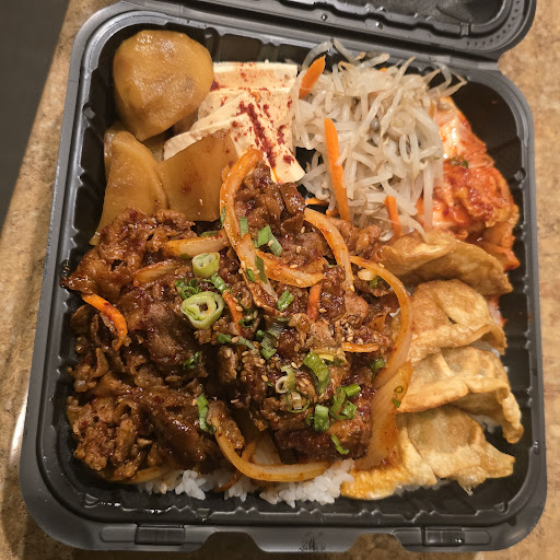 This is my second time visiting so this review covers both. The portions are huge, yet something is missing. There's an inconsistency with umami. The meat jun had no flavor, but today's spicy pork is killer! The kimchi is good, yet the rest of the veggies don't have enough flavor. The bean sprouts need flavor and the shoyu potato is hard and dried out on the edges. The biggest thumbs down is I open up to find there's no sauce for the mandoo. Really? I have to ask?! For $18 I shouldn't have to ask. 🙏