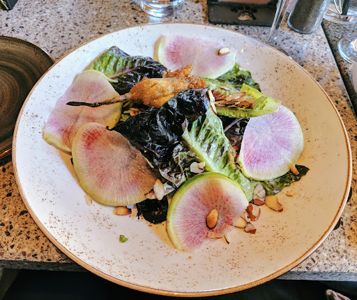 We ordered small plates to share, a couple of salads, some lovely mixed drinks, and desserts to finish it off! Everything was seasoned well, with flavours playing off each other in a dish to make each bite a well rounded experience. Portions were perfectly sized, even sharing the small plates among 4 people. I ordered the green goddess salad, which was delightful and fresh! The watermelon radish was so good, and the goddess dressing was perfectly balanced between tart, herbaceous, and sweet. The feta-stuffed zucchini flower it comes with was delicious and unique! Paired with sips of the rosè elderflower punch and the blueberry lemon cocktails, the whole meal all felt refreshing and bright.