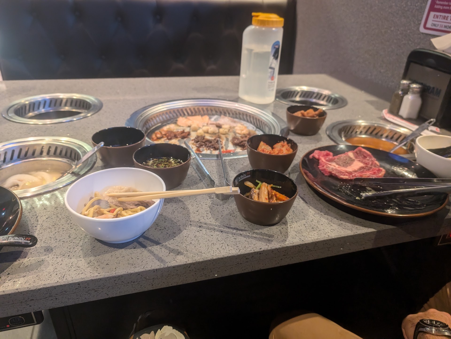 I really wanted to give this place a higher review but the overall experience was really just ok. The place itself is very cute, animated and clean for sure. The lady that greeted and seated us was talking to someone on her AirPods and just sat us without really saying anything. The set up they have there is a self serve bar with all sorts of meats, sauces and stuff. This was the first self serve Korean BBQ I’ve ever been to. I’ve usually ordered from a server or an iPad and it gets delivered to us. They put a parchment paper on the grill… the point of grill is to get a char in my opinion so we removed the paper. What I will say is that they did have a very large variety and selection of a ton of meats and seafood options. Even for your hotpot you had your veggies and noodle options. We tried to order a Diet Coke from our server and he said we had to get that ourselves from the station. We’re like ok…