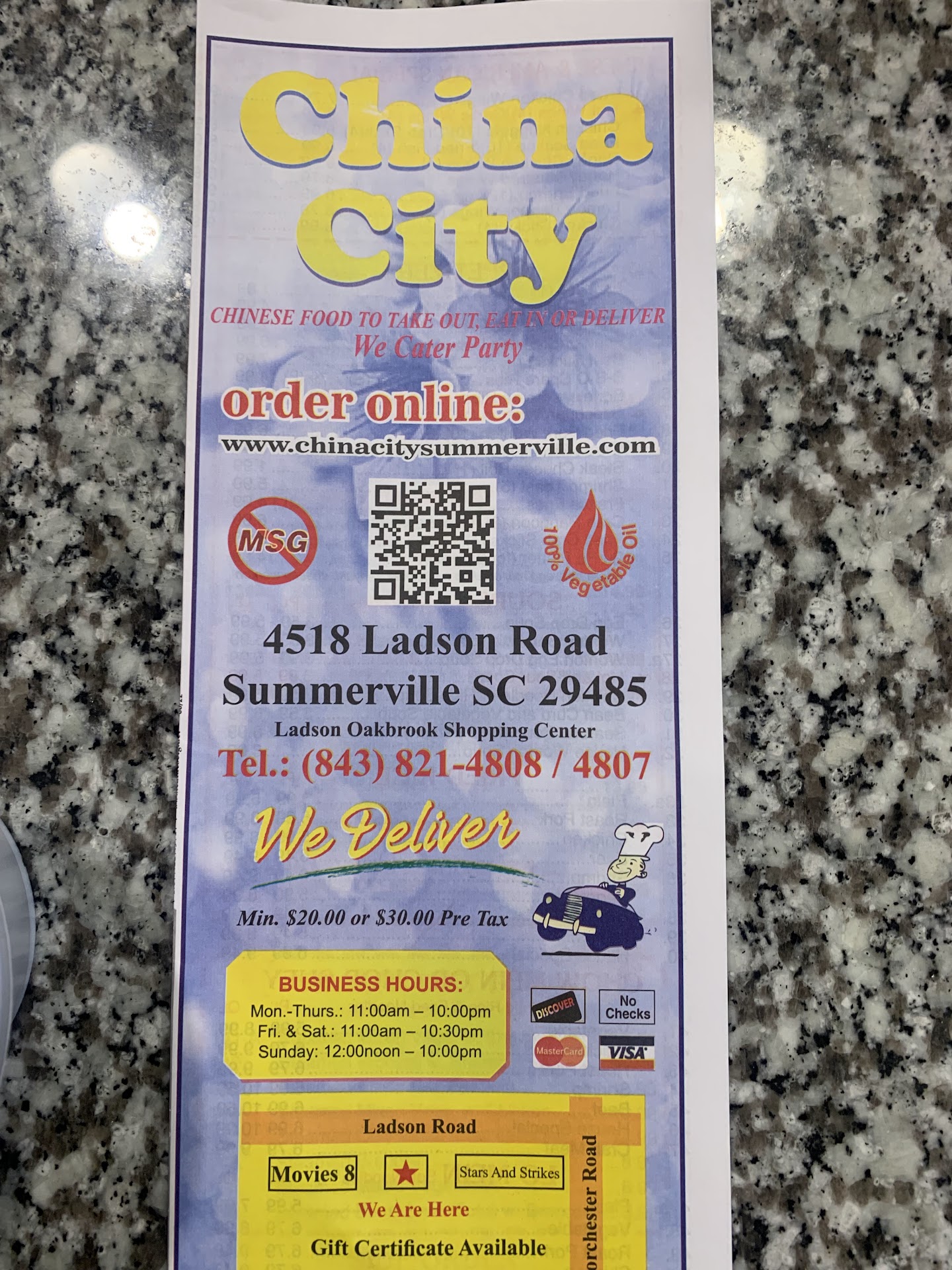 I've moved to this area after living in NYC for the past 20yrs. Naturally I've been trying to find Chinese cuisine that came close to what I was use to up north. Naturally we checked views and based off the views me and my daughters tried 2 other locations and was not happy. So when we came to China City, we were skeptical. Well I must say, my first time at China City was awesome. Had I done a review then (1 year ago) they would have gotten 5 stars 🌟. However these past 6 months has been a little hit or miss. The food is still good. It's the mix-up in my order that has been disappointing. I don't live in the area. I actually live about 25 minutes away. So yes I travel for what I want when it comes to food. We order via phone call. Same order as always. However the last few months, the orders have been wrong. Yes I usually check my food before I leave, but the 2 or 3 times I don't check seem to be when the mix-up happens. They read back my order everytime, which is why i don't always check it myself. But lately, even then, there is chance the order is wrong. Thankfully the food is good and we make it work. However it is disappointing when you have your mind set on one thing and get something completely different. That is why I am giving a 4 star rating. (At the location I went to while in NYC, would show us our food before completely packing it up) I think i was spoiled a little with their service. I will be checking every time going...