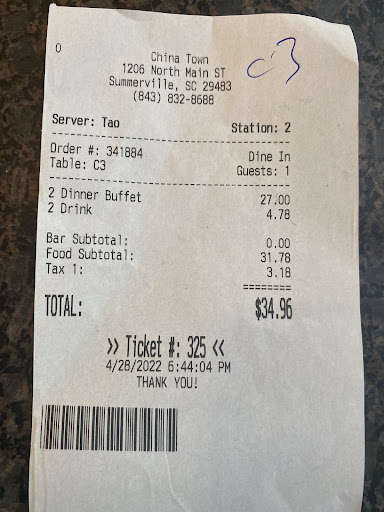 Read moreI'll tell you this I won't be back!!!!! Picked my 6 year old son up from school and it's an early release day so he was hungry. Usually we do take out but figured it would be nice to sit down and eat . Well my 4 year old took 1 sip of tea and ate 1 piece of chicken I ate 1 bite of rice and 2 pieces of chicken and drank a few sips of my water then my 4 year old got sick all over me and himself . My 6 year old ate IDK maybe half a plate !!!! So I picked my 4 year old up ran outside yea nobody wants to see that when they trying to scarf down lunch and get back to work but it happens man he's 4 years old !!!!! BUT THE EAY U HANDLED IT CHINA TOWN U SHOULD BE ASHAMED OF YOURSELVES!!!!! I ASKED IF I COULD COME BACK IN AFTER I GOT HIM STRAIGHT TO SETLLE UP THE BILL AND SHE SAYS NO CAN THE OTHER STAY INSIDE TALKING ABOUT MY 6 YEAR OLD !?!?!!!! Wow !!! So yeah with my sick son in my arms and you know yes puke all over us I dug in my purse got a $50 and gave it to her asking my 6 year old to grab the change cuz he was dry heaving at that point . So 15 dollars in change and y'all inconsiderate bunch of pricks made$35 off me for a few bites of food and a water tea and Pepsi ?!?!?!! Wow yea it's not y'all's fault but I mean come on u know we didn't eat and u wanted my 6 year old to sit inside to make sure u got ur money !!!!!!! ARE U THAT DESPERATE !!!! Man I'm not even gonna really say what I want to but I just want SUMMERVILLE TO KNOW WHAT THE HELL THEY FUNDING !!!!! I AM BEYOND SPEECHLESS THIS IS WHAT WE HAVE COME TO NO COMPASSION NO SYMPATHY NO PITY NO FEELING NOTHING FOR THE NEXT MAN LORD HELP US ALL AND YOU...