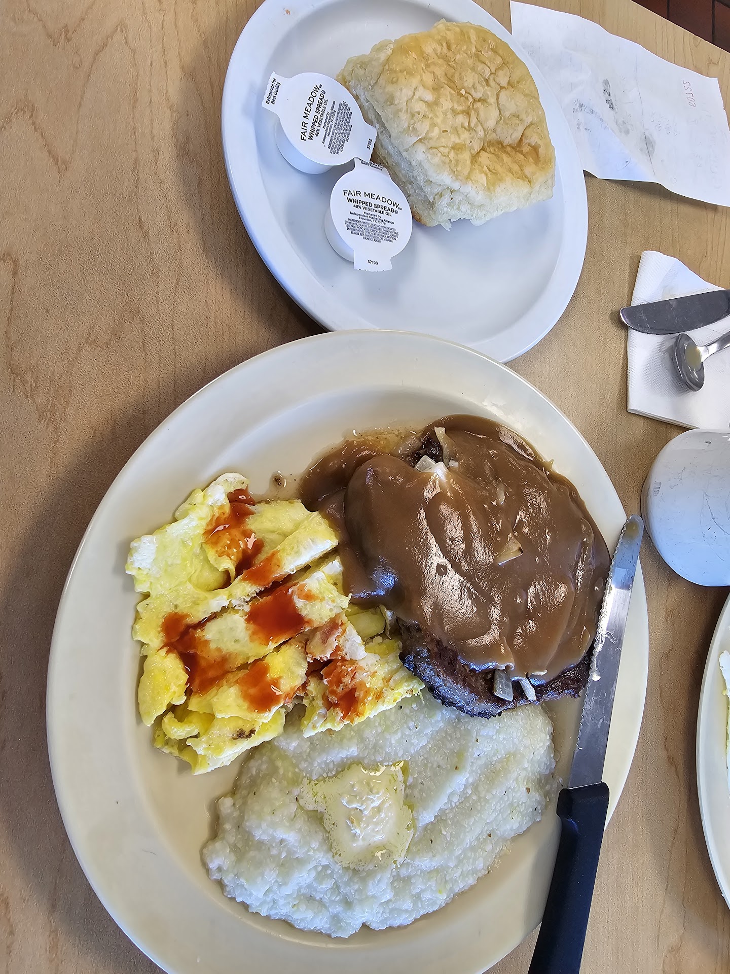 Read moreUpdate: Today's visit was a huge disappointment... First we sat down then proceeded to wait looking around as a red haired waitress with tats walked by our table several times, made no move to bring us menus. After 15 mins she finally brought our menus..we waited for another 10 mins before she took our drink orders, she brought us our drinks 5 mins later, took our orders, I ordered chicken breast with greens and mashed potatoes, about 20 mins after ordering we received our food...my roommate ordered liver with onions & gravy on the side and mashed potatoes. I received green beans instead of greens, my roommate complained her liver was burned until it was dry and tasteless. No, the waitress did not cook the food, but she should have told the cook, no give my customer liver that isn't burned. A few minute after we placed our order, two men sat down at a nearby table, they barely sat down when she brought them their menus took their drink orders, returned, took their food orders, all in a space of 5 mins, didn't take her long to serve them their food, they were done before we were, but we left first..totally pissed off.😡 Another complaint they need to step up their menu, add new meals..after 6 yrs we don't visit as often as we use to.. After this visit we won't be back anytime soon. If I could give 0 stars I would..we use to be...