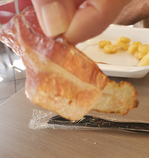 This is our usual Hardee's since it's close and mostly has pretty good food. I got a cinnamon roll and it was really good. We also got a big breakfast plate, biscuit and gravy, eggs, bacon, tots. Great except for the bacon. Asked for well done, crisp bacon. Gat medium cooked limp bacon, which I like, but this wasn't my meal. As you can see the bacon is not crisp. It's cooked just enought so the fat was...