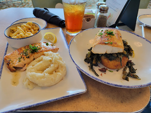 Atmosphere was cute! Service was okay, our server seemed spread thin. Food: HORRIBLE. The picture looks amazing. Sweet Tea Glazed Salmon with Mashed Potatoes & Mac & Cheese. BBQ Maui Maui BBQ Gastrique, Pimento Cheese Grit Cake & Collards. The fish we both ordered was the ONLY thing hot. Our sides were COLD. There was absolutely NO flavor to the cold mashed potatoes, no salt, no butter, no seasoning at all. My mac & cheese was cold, dry and aldente, not cheesy, box mac tastes better, I love mac & cheese its hard to mess up. My salmon was hot and tasted fresh. First few bites definitely tasted the sweet tea on the salmon very good, then not much flavor but was fine, I'm new to eating fish but it was good not bad. Good size piece of salmon! Moms maui maui had no BBQ confusing. It was the only thing hot on her plate. The fish was fresh, good, just bland, not alot of seasoning at all for the good size piece of Maui Maui, but the fish tasted good not bad. The collards were cooked well, best tasting thing on her plate, not hot though. The pimento grit cake was also cold. I didn't like it when I tasted it, she said it was okay. Are there supposed to be biscuits with dinner? We never got asked or offered biscuits. When we were leaving another table said they had to ask. Do you have to ask? Confusing since we had bread plates already on the table. We could hear after our order, the two tables near, the kitchen was running out of everything. This was 5pm on a Tuesday. We didn't say anything about all the cold food because it seemed like the place was short handed. Then the bill, it was over $70 for this. Also, we had cash but decided to use the card, the server did not tell us there is s service charge for using a card, which added to the bill, when she seen us trying to decide cash or card. Just mentioning it would be nice for those who may have the option to use cash. Just wasn't an experience we were expecting. We expected flavor with southern food. They also were not busy when we got there, so not sure why we got served cold food. I appreciate the fish being hot, we didn't get sick. But its like someone plated our plates before cooking the fish, so when the very hot fish came out the sides were room temperature when we got them. If food is made without things like salt, for people who might need to watch it, some kind of heads up about little or no seasoning on things would be great, so those who can have it, dont eat unseasoned food. We don't know if this is how this restaurant always is because the mixed reviews, but spending that much money here we most likely won't be back. People rave about downtown, IDK if I'd risk another experience. Just not sure why everything was cold and unseasoned..