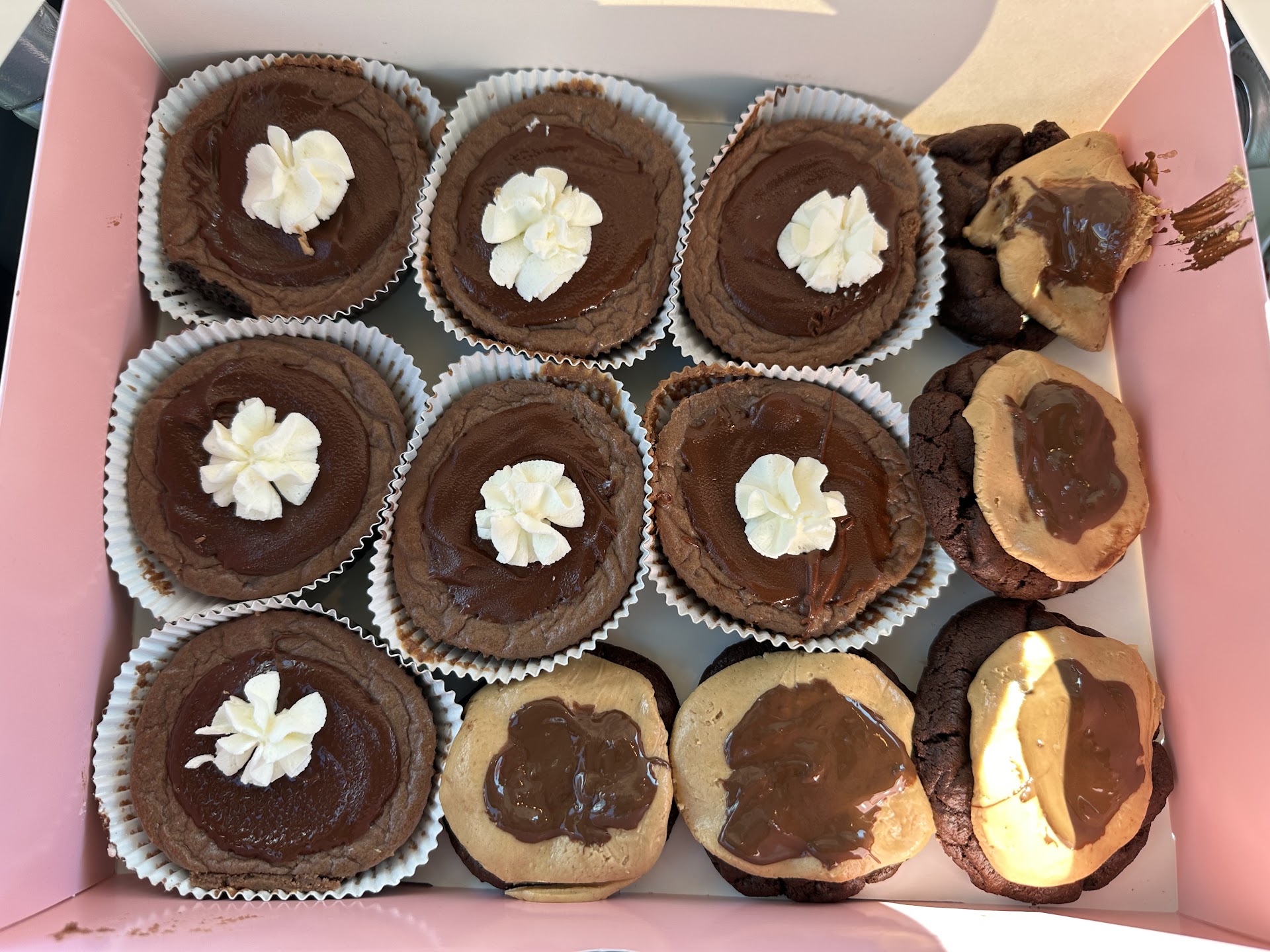 I made an online order for a dozen mini cookies. Seven of them being the Nutella cheesecake and five of them being the peanut butter buckeye brownie. Upon arrival, they let me in, which was nice and didnât have to wait in the long outside line because it was a pre-order, but I waited an additional 15 minutes after my order should been done. I was greeted by a very enthusiastic young man trying to make everyone happy that they were there. When I received my box, the cookies looked fine except they were starting to slide and melt. When the gentleman tried to close the box, the one end wasnât closing and the cookies were getting crushed in the process and smearing chocolate around the edges of the box. I went to my car and tried to close the lid but all I was doing was crushing my cookies. I went back to see if I can get a small box to to put a few cookies in so my larger box would shut, but then I was told I would possibly have to pay for another box. I wasnât happy to hear that after spending $31 in the first place then to be told that because the box wouldnât shut, I would have to pay for an additional box didnât seem right. The lady at the door explained my situation to management. They took my box and they could see that I definitely needed something else to work, which was nice to hear. But they gave me my cookies back and they shorted me, one of the buckeye cookies that got smashed by the box originally and forgot to replace it. When I mentioned it to management, they tried to tell me that they gave me an extra cookie because of my trouble and she started counting them after I told her no Iâm shorted a cookie and she realized that they did in fact short me a cookie. The cookies taste fine so thereâs no problem there but it just seemed like a big hassle or someone who just placed a pre-order so they wouldnât have to go through things like that. The first photos are how I originally received my box not able to close it and the last two is what I was able to bring home in two...