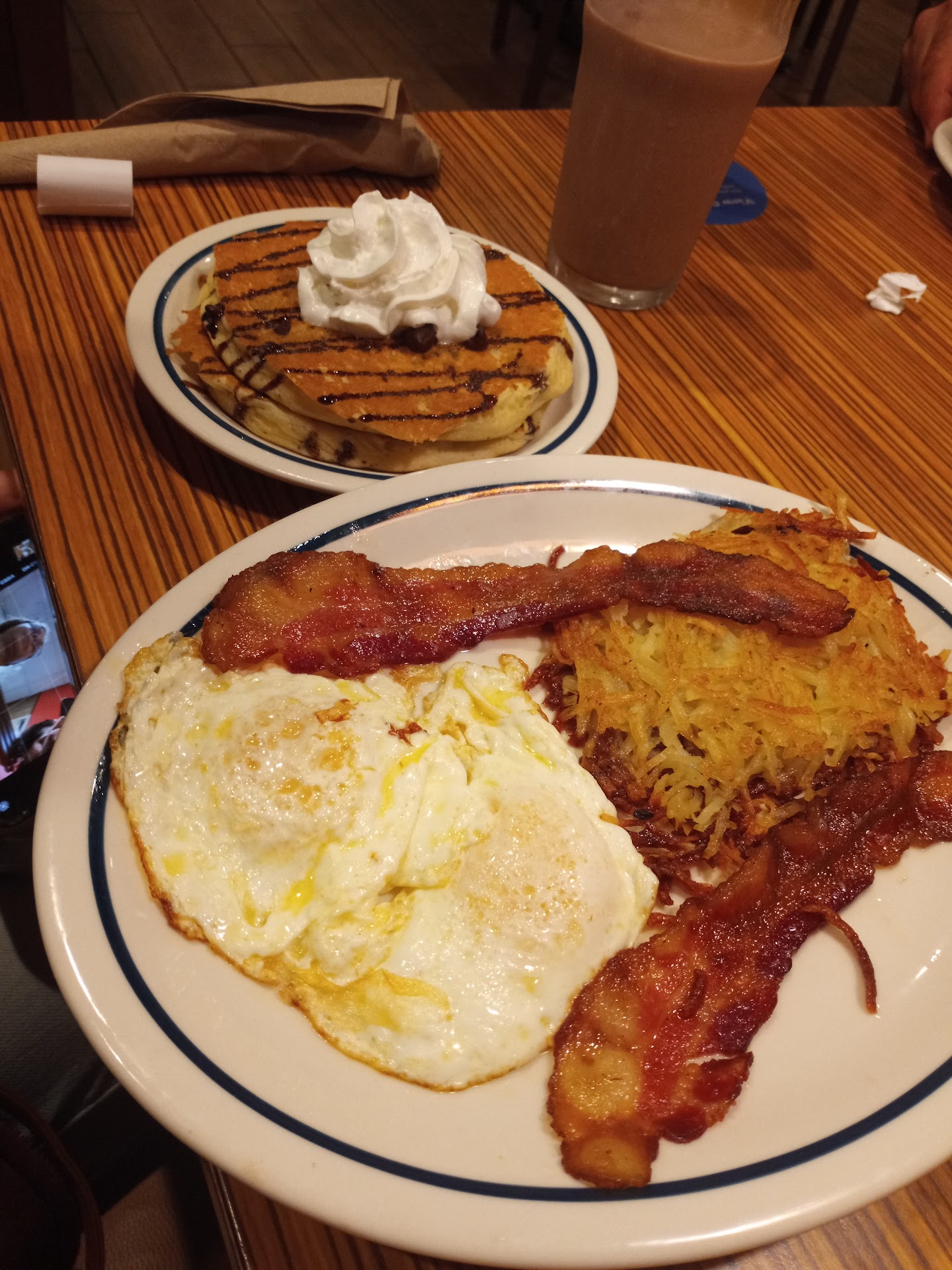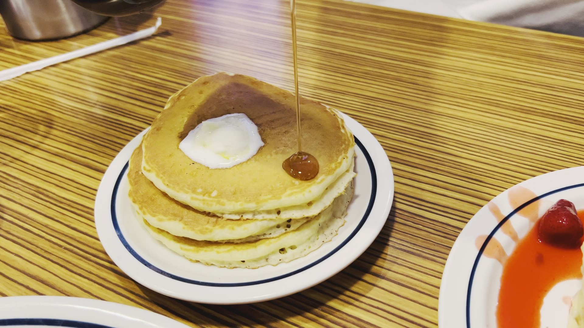 I had quite an interesting experience as far as my order was concerned as well. I had ordered one of the meals and asked for strawberry banana pancakes instead of the regular ones that came with my meal. When I finally got my meal, I had received the two regular side pancakes as well as a stack (of four) strawberry banana pancakes (unfortunately the photo I took magically disappeared from my phone, otherwise I'd have posted it as well. Note: Stack of pancakes are not the same size as the side pancakes shown in the photo). I began eating and noticed that my eggs were under-cooked (I ordered them fried hard, when I received them, the yokes and whites were still a bit runny).