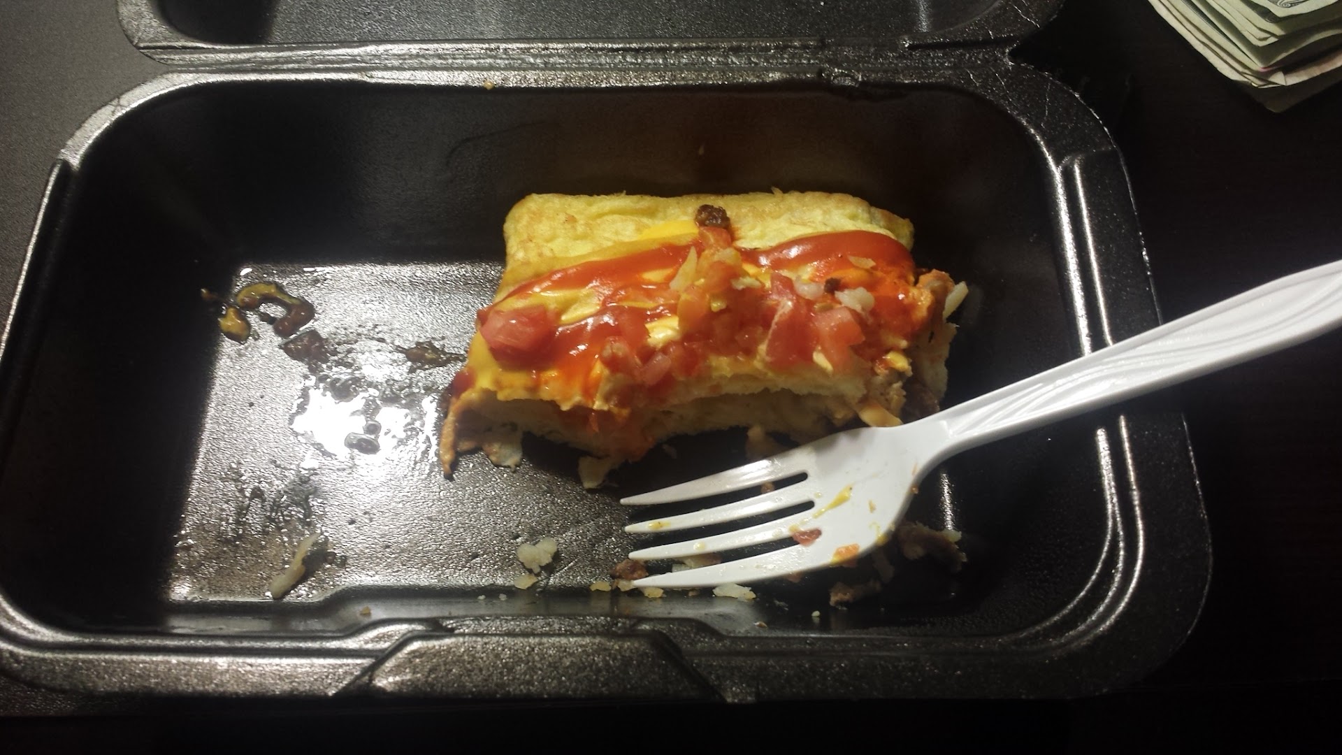 I realized the majority of the eggs were underdone, so I only had a few bites. I moved onto the strawberry banana pancakes and was only able to eat about 1/3 to ½ of them. My waiter came back and brought the check and a box. I was looking over the check, which confused me. A manager stopped back and asked if everything was okay with the check and I said I wasn't sure, but I guessed so. She took a few minutes and explained that the kitchen had gotten confused by the order and even though it does say to substitute the pancakes, they made the complete order, which it looked like was added to the bill as well. She said both of those charges were removed, and there was a line on the bill for "Open $ Food" for $1.29. The Manager explained that this was an up-charge for substituting the pancakes. Then there was a compensation where they removed the charges for the strawberry pancakes.