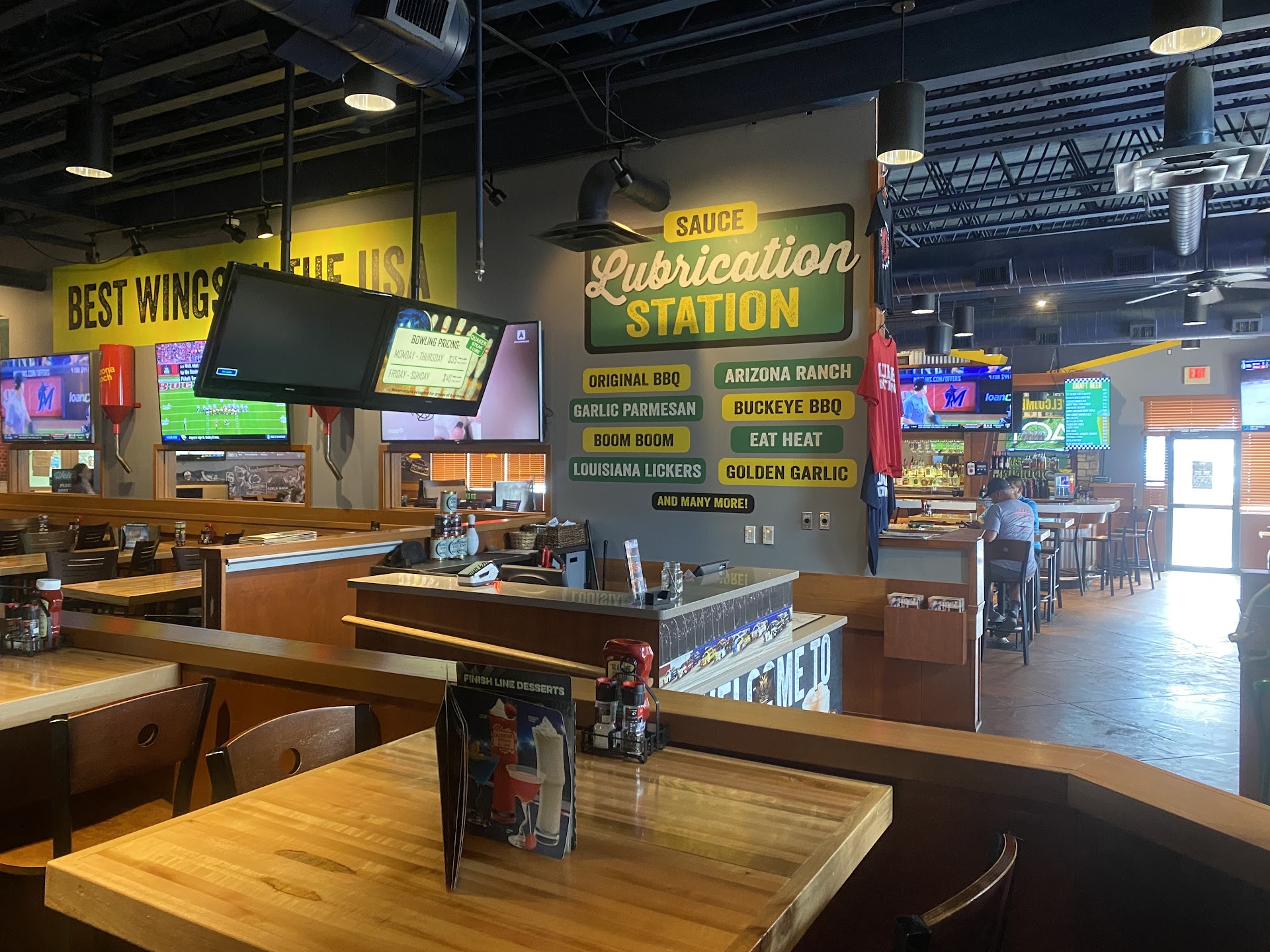 Read moreThe two stars are for the multiple hostesses. We were promptly greeted and shown to our lane for bowling that we reserved earlier in the day while staying at Splash Lagoon. The hostess showed us our table and it was a low table with 4 chairs, we are a family of 5 with an 18 month old and need a highchair. It was dinner hour on a Friday during a bit of a rush. Our waitress took our drink order and came back pretty quickly with them, placing them on a 3 chair hightop table while using the original table to place dirty trays and dishes on. She asked if we would be ordering food to which we replied "yes we will start with appetizers". We bowled for about 30 and the waitress came back, and seemed to be rushed, to ask if we were planning on ordering any meals as the kitchen was backed up and it would be best to get the order in. Still no appetizers but decided to order. The waitress rushed through my eldest son's order, my next son's order and my husband's, then proceeded to grab the menus from everyone and say "okay, that's it" I quickly ordered something for my youngest son. And she disappeared. About 5 minutes later the appetizers show up and a hostess comes to inform us that another patron has hit our car in the parking lot. The hostess call the local authorities for us and my husband went outside to wait. During this time it was of course the talk of the restaurant. Our waitress in passing quickly asked if it was our car as I'm now alone with my 3 boys. Time ran out on our lane as I'm going between the parking lot and the restaurant checking on my husband and my children. The hostess was able to extend the time on the lane to keep my children occupied. Within 15 minutes of that the entrees arrive, I'm assuming from the kitchen staff as I cleared the table for the entrees The waitress didn't bother to ask if husband's dinner should be held until he was finished with the officer outside, husband's dinner sat for another 15-20 minutes until his stuff was complete. He ate a cold $31 steak. I approached the waitress and told her that we needed our check. She then at this point tries to take time out of her busy schedule to chat about the car accident and if we need anything. I repeated that we needed the check and that we were ready to leave. She then tried to engage conversation with husband and I asked him to give her his card so we could pay and leave. We spent a total of two hours at this establishment and felt as if we were a burden to our waitress. I won't call her out by name but she knows who she is and my only advice is this, even if you feel rushed your customer's shouldn't feel rushed. Your tip could've been at least double what it was if you didn't rush to get...