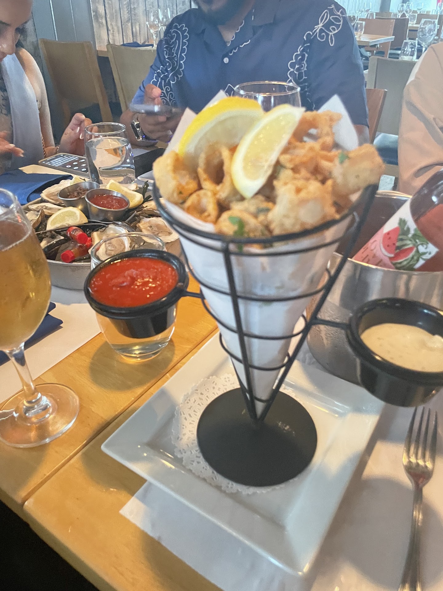 We ordered the calamari as an appetizerâgood but Iâll never understand places that need to pack fried food into weird vessels for serving, just put it on a plate. For our mains, we had the grilled shrimp (they ranged from U16/20 to a U7, fairly inconsistent given the menu states U7) with escarole and beans (which were fine) as well as the scallops with a cauliflower concoction that looked like dog food (tasted fine).