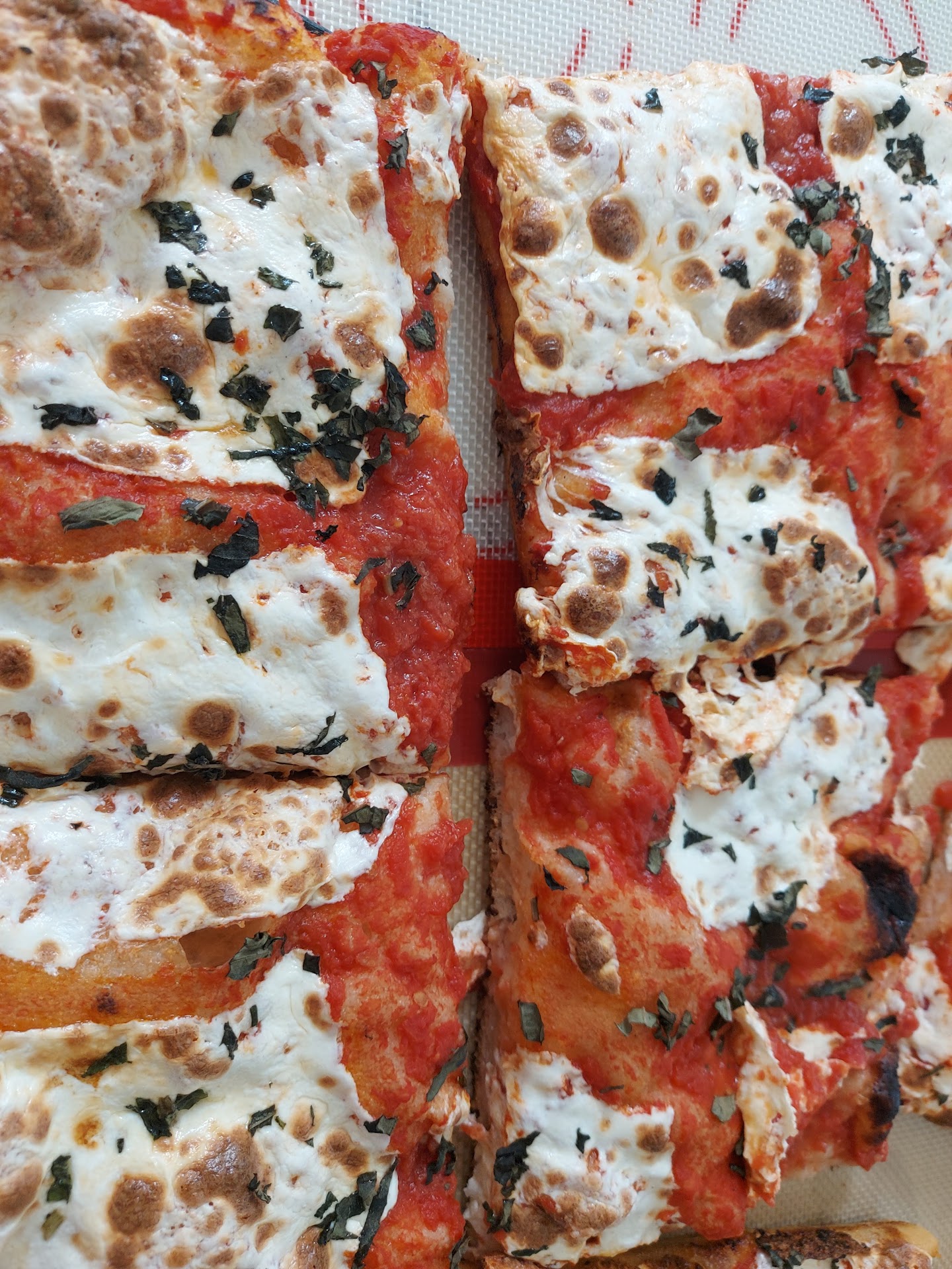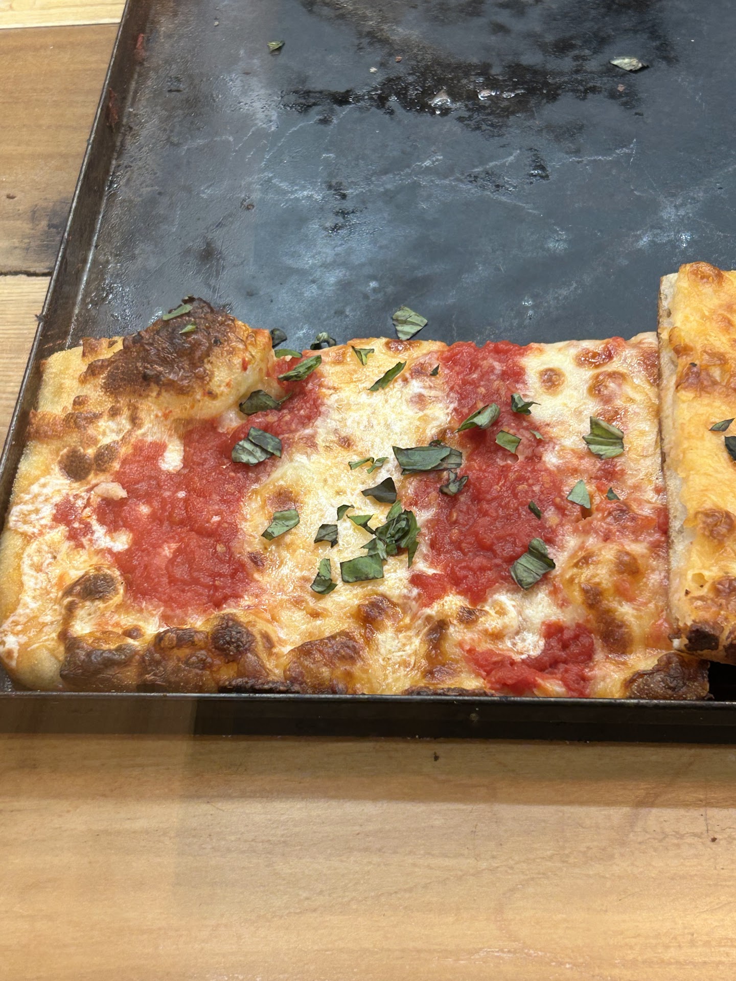 PIzza is all square pies with crispy edges, definitely in the Detroit/Buffalo style. We love that, but fair warning if it's not your thing. Upside is that the slices are big enough that you honestly only need one to make a meal, and odds of getting a corner are high if that's your thing.