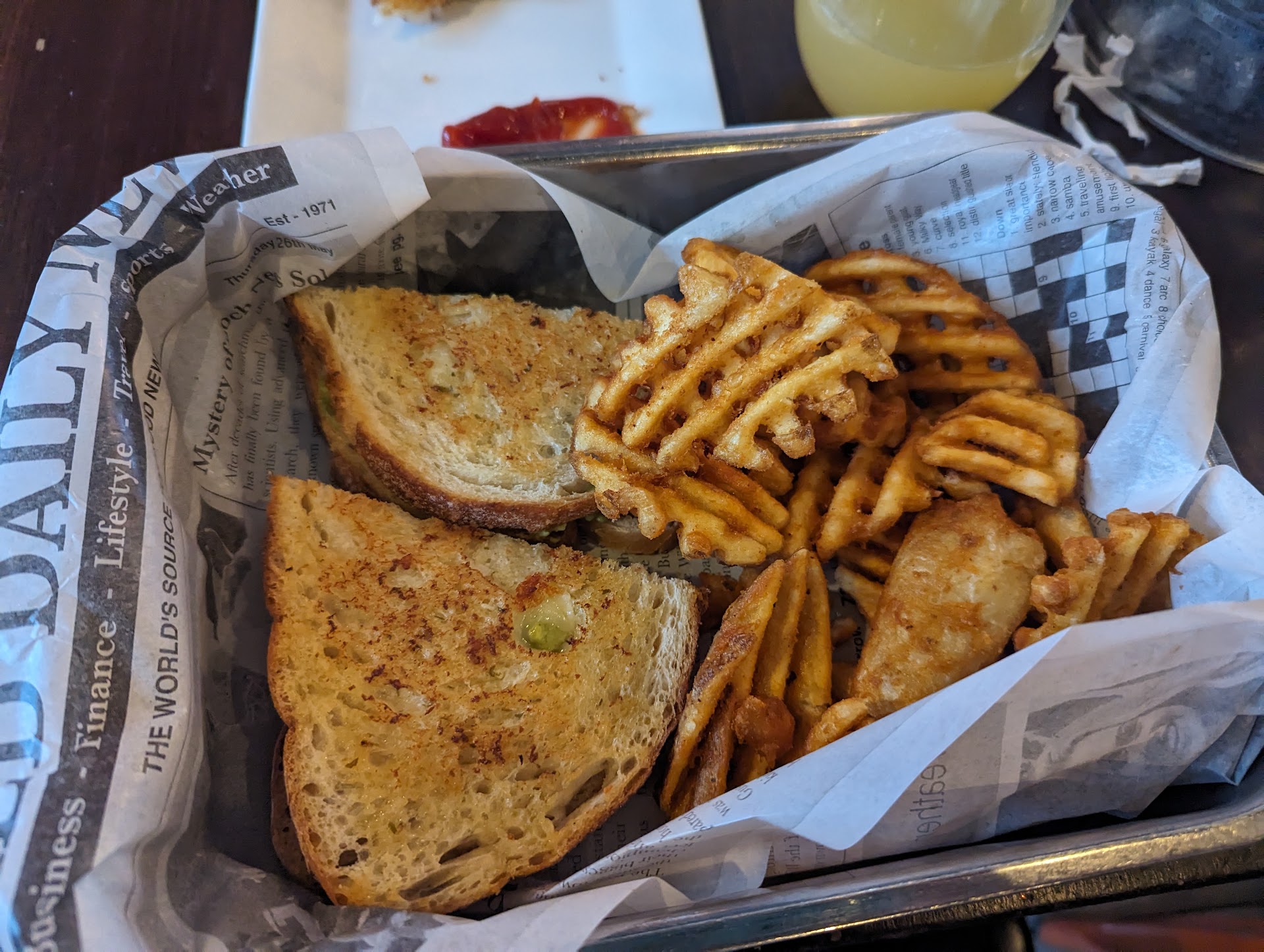We stopped in around 2ish, and the place was very busy; we had maybe a 10-minute wait, which was more than reasonable for a crew that didn't (and really couldn't - you rarely know exactly when a hike is going to end) make a reservation beforehand. I was pretty famished but thought it might be a little naughty to go straight for the bovine on January 1 so I went with the Garlic Avocado Grilled Cheese, which also came with a light tomato pesto spread. Very tasty and the garlic gave it a nice overall flavor; if you've been to a Tropical Smoothie CafƩ, they had a flatbread version of this last summer, which was slightly better in my opinion - they didn't go as heavy on the cheese. But this one had generous helpings of avocado, which is typically an add-on that places skimp on when they can. The waffle fries on the side were fine; I thought they were a LITTLE bland and needed the ketchup, but one of my chums took one for the team and gobbled most of them up in my absence.