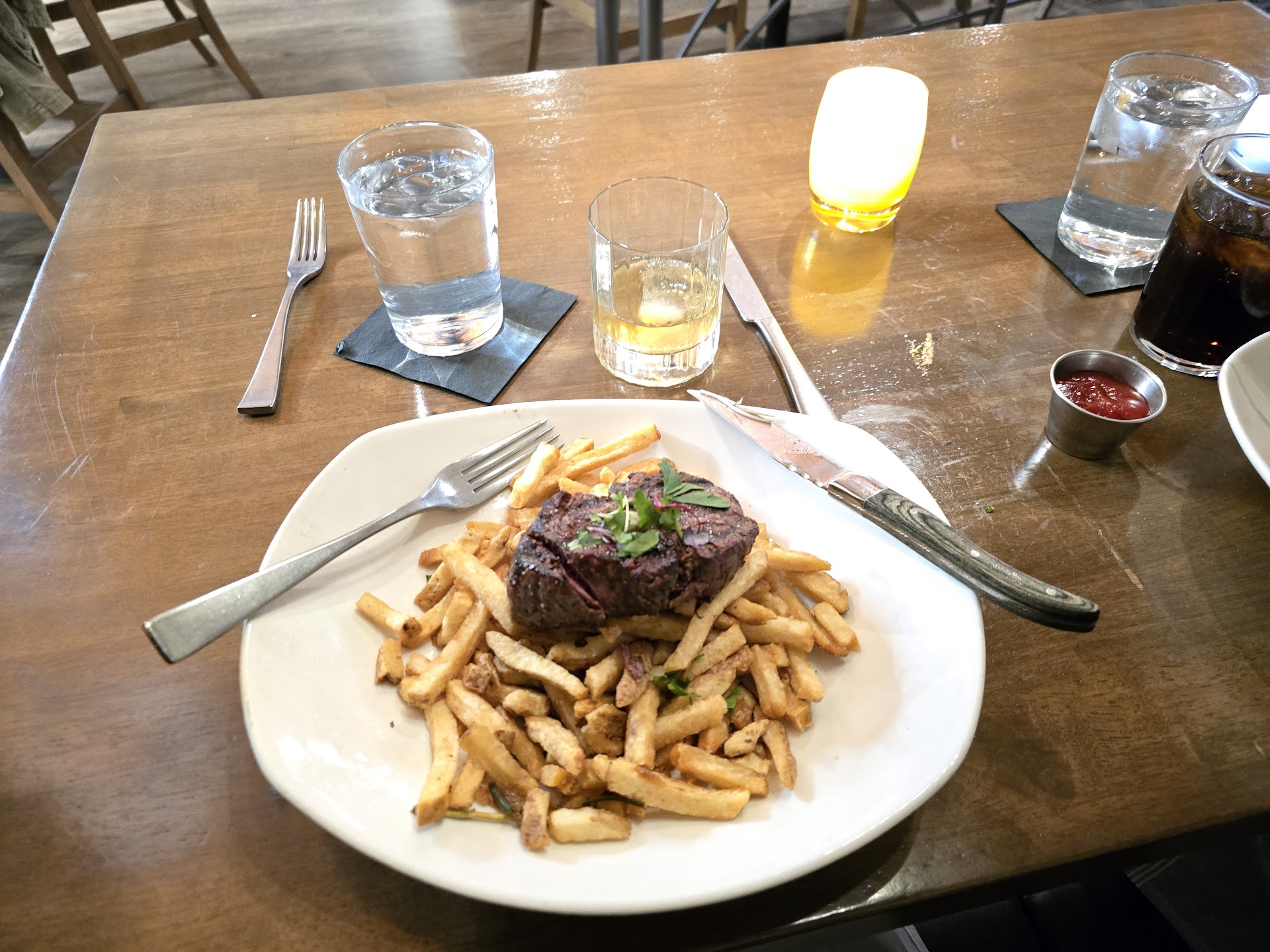 We arrived before 5 pm and as soon as we walked in, I felt as though we were inferior as the host looked us down. He asked if we had a reservation and I said no. He provided options to dine inside or bar seating and I returned with dining. He then paused and offered an outside dining location but not next to the rail. He must have assumed we were going to dine at the bar as we walked in. Such a nice night last night we opted for the outdoor option. I was thankful. He showed us out to the patio, opened the door for us and we were left in front of him. It was clear which table we were going to, but generally the host leads you to the table. This made for a little awkward situation as we stood there for a pause, allowing him to lead us to the table. He sat us and said something to the effect of enjoy your meal kids... That didn't bother my wife much, but I kind of felt like I wasn't the type of guest he was looking for. Our server Rachel was extremely attentive and checked on us quite often. We really liked her, it was a little like she was wanting to let personality out but her training may have required her to be a little more reserved. We opted for the 12 oz ribeye, medium and medium rare, both with vegetables and a salad. Salad was acceptable, ribeye was overcooked in my opinion... Granted they were thinner steaks so getting it right is harder. My steak had a small amount of pink in the very center only, probably should have ordered rare. Vegetables were prepared well and cooked perfectly. The thing about the ribeye and vegetables were that the flavor was left to be all natural. I would have preferred some seasoning, a little sea salt or Himalayan would have gone a long way to increase the flavor profile. Wife and I opted for dessert and chose the strawberry rhubarb crisp. It had a scoop of strawberry ice cream in the center. The crisp itself didn't have that rhubarb tartness nor did it have that sweet strawberry flavor. It wasn't flavorful enough to even quantify what was missing or where it could improve. Maybe we didn't choose wisely from the menu, I have no doubt that there are better options here. My other thought is that since this restaurant is new, it will definitely have some things to work out as it matures. My wife and I enjoyed the outdoor seating and ambiance, that really made our evening. That is something that isn't recreated locally. Will we be back? Not immediately, I think we will give them some more time to grow...