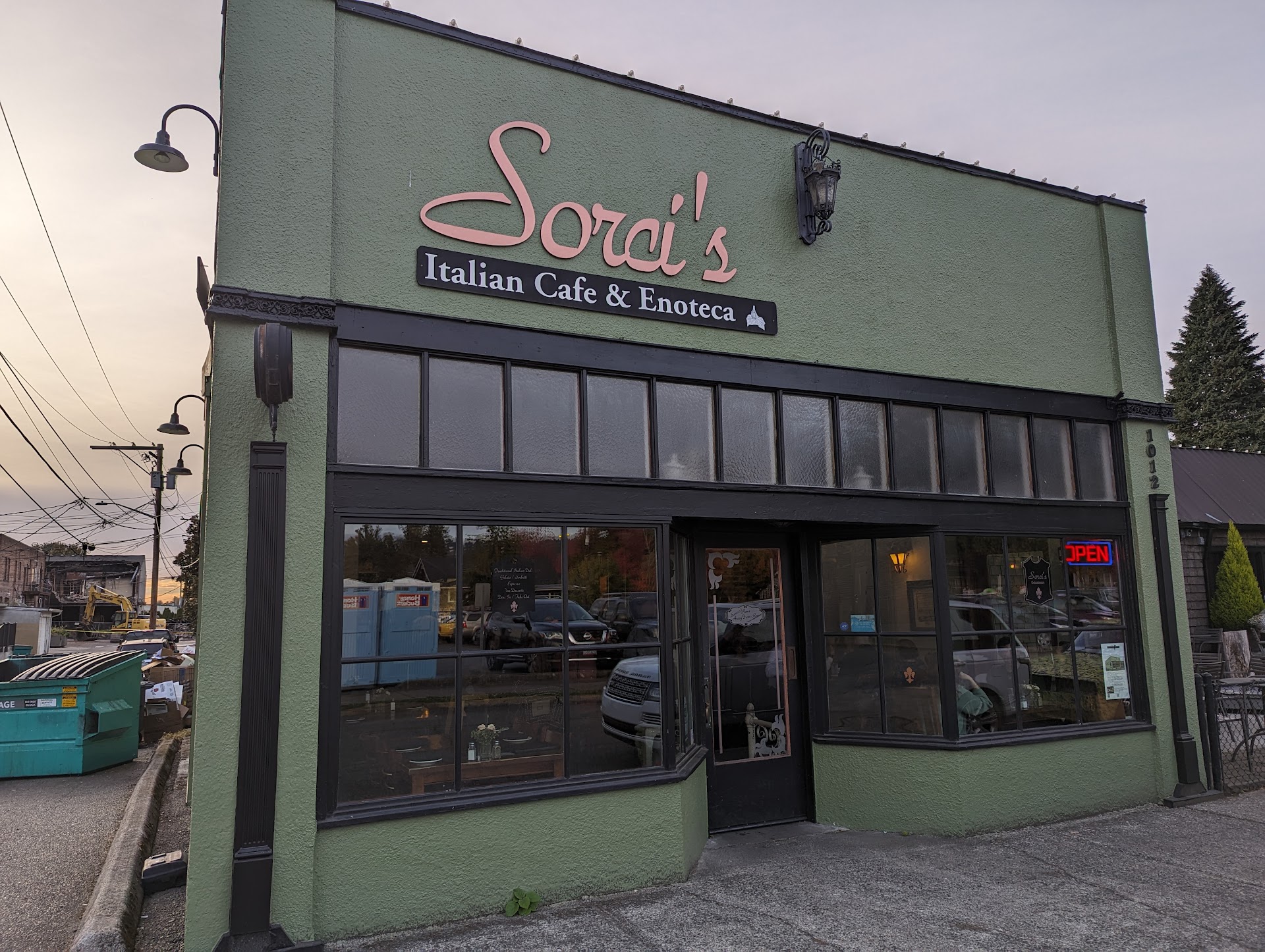As I said, I never complain, but for all of us, the dining experience we hoped for at Sorci’s went downhill further from there. When the food came, the fettuccine was barely warm and more watery than rich and creamy. My lasagna was tasteless and very dry — I suspect cooked weeks earlier and then re-heated. My wife’s chicken piccata included risotto served in a solid clump… also tasteless. Etcetera. Before long, at 9:00, they were turning off the “Open" sign. It didn’t matter. While we had been very hungry, we ate a little but cut the evening short and left many partially tasted dishes of food that remained at Sorci’s as we declined any need to take any of it home.