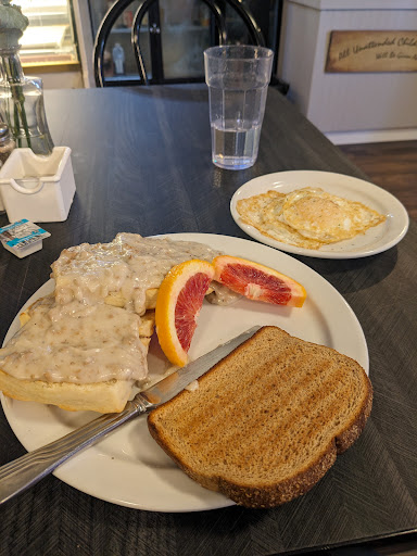 Cute but slightly hard to find place with lackadaisical service. This is offset by their willingness to let my wife bring some of her own food on account of some severe dietary restrictions she has to deal with. I went to the SC as part of an effort to find the best (in my opinion) biscuits and gravy in the area, and this place is a contender for my top 2. The 2 times I've gone up until now, I had a bowl of their rhubarb crisp for a pre-breakfast/brunch appetizer; it's really good. Their biscuits are flat and dense but delicious, and their gravy is very good too. They confirmed that they don't use oil in their biscuits, but they do use cow's milk cream. (I've stopped eating the biscuits at Hops N Drops due to the fact they have soybean oil in them.) Next time (and there will be a next time) I go to the SC, I need to remember to take green Tabasco sauce with me; they only have red Tabasco and equivalents (e.g., Tapatío). They add some kind of herb to the top of their fried eggs; I really like that they don't just serve them up plain. They'd lose a star for their service, but because I was able to have my wife with me there so we could eat with some friends, they get the star back.