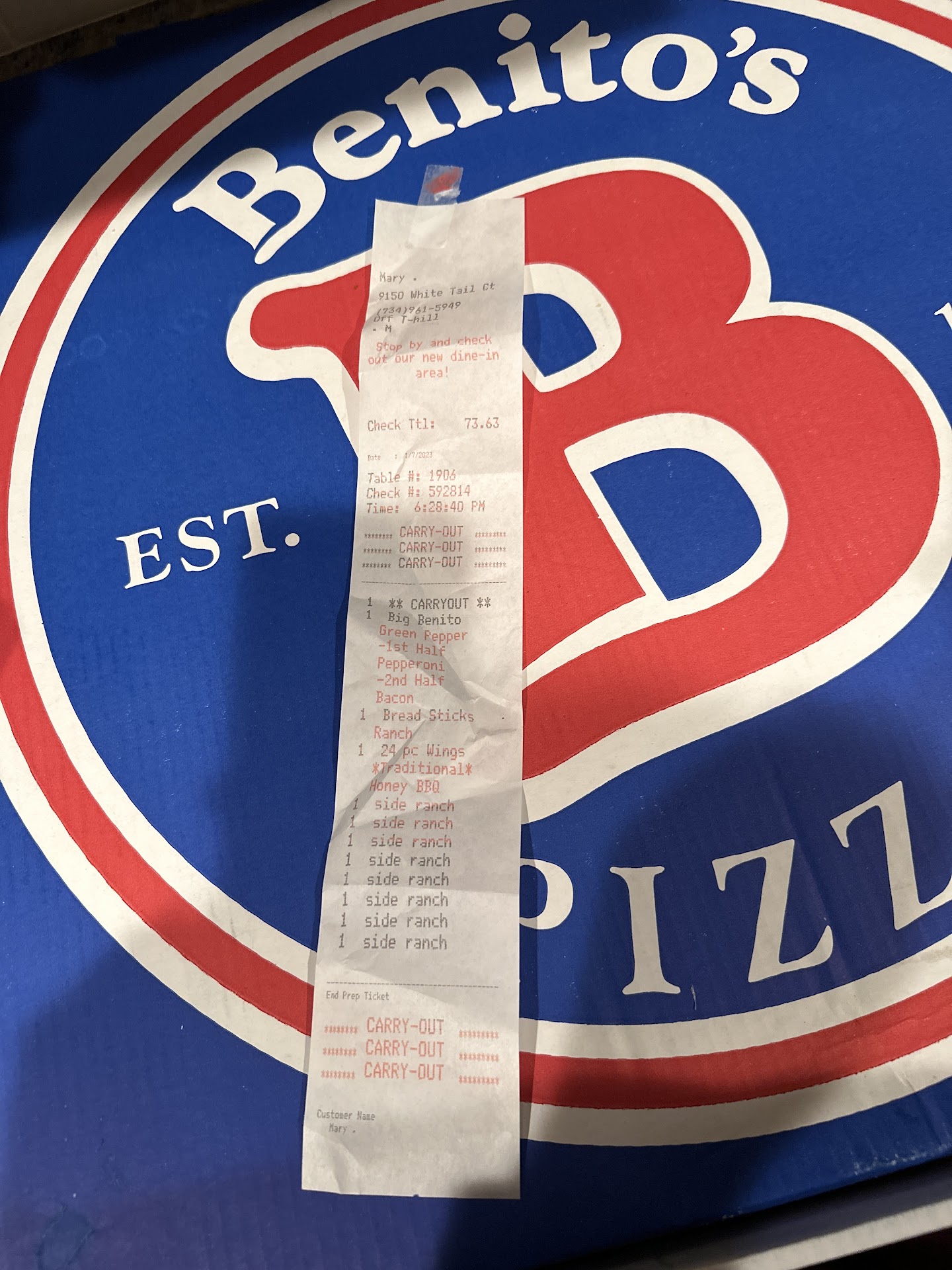 I visited this location tonight 1/7/23 around 7:25 pm. I placed an order at 6:28pm for my family a Big Benito in the squares with pepperoni bacon and green pepper, regular bread sticks, and 24 barbecue wings. My order came up to about $73.00 and When I got home I didn’t receive squares in the big Benito.