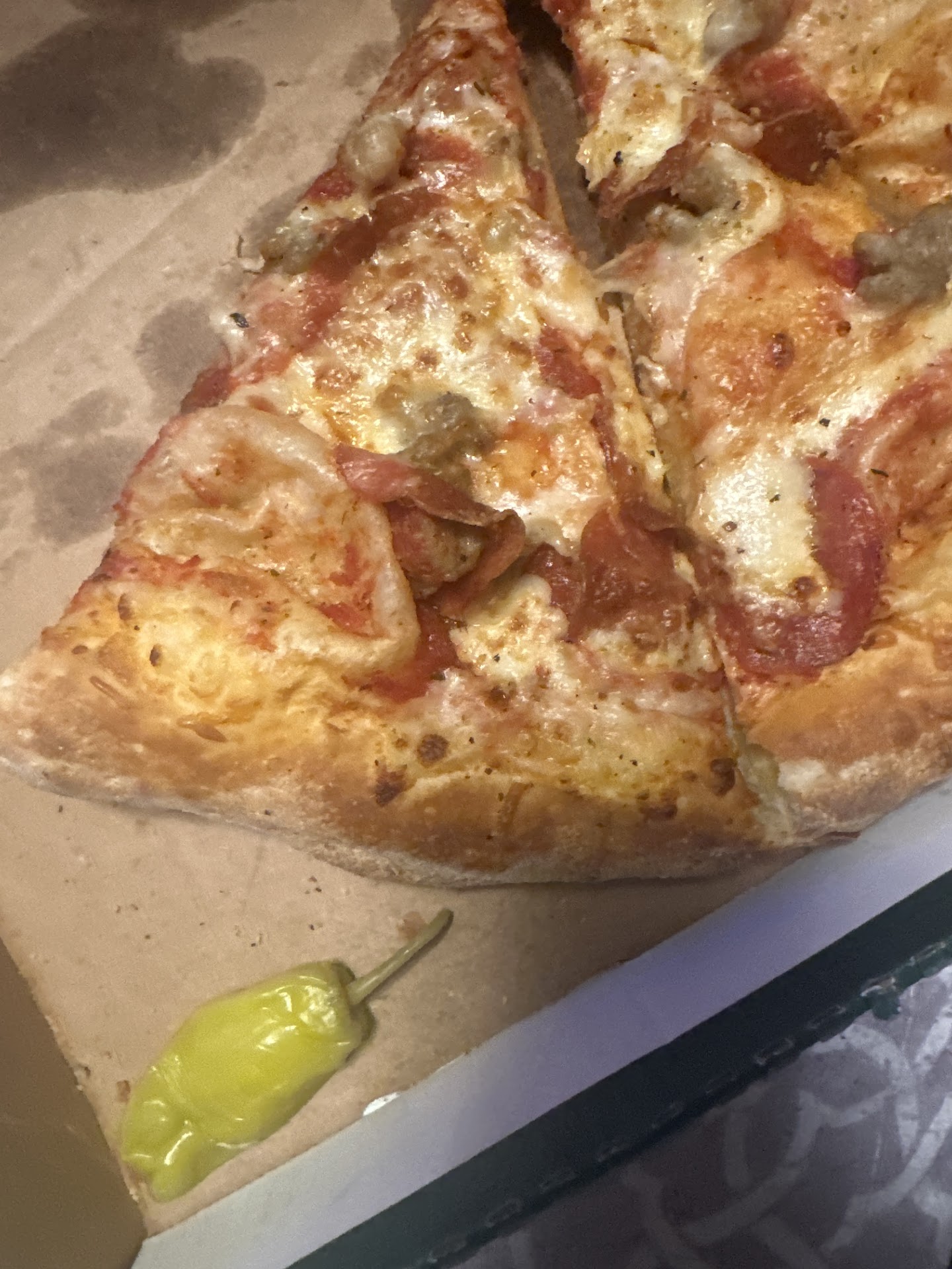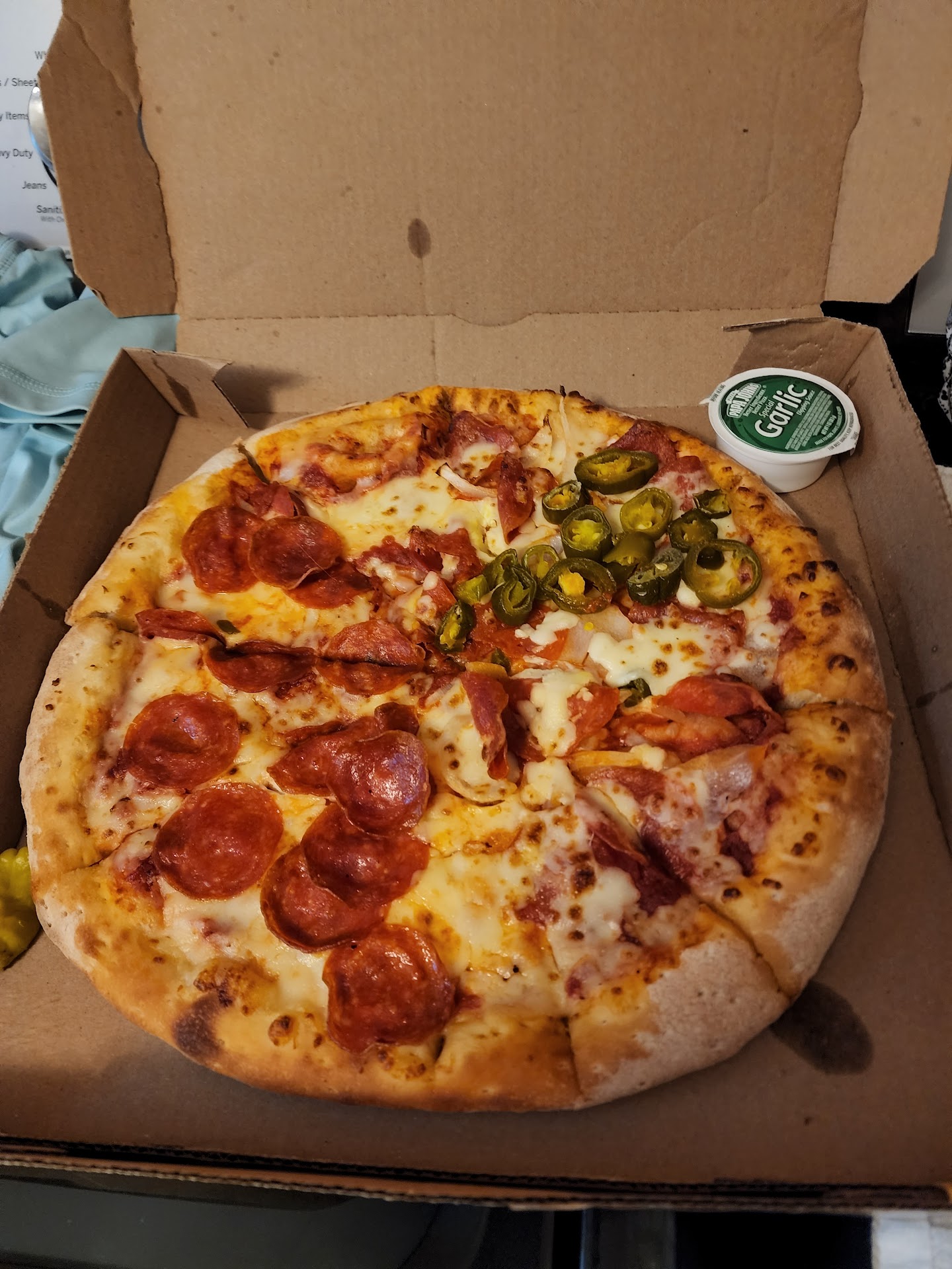 Read moreMy pizza pepperoni . With onions and jalapeños. This is what I got. I called talked to manager that could not fo anything but send a driver out to replace. But since I do not live in there delivery location my I would have to drive the 20 min up there and 20 back to the house. My kids was starving. I could not do that. She said well you can take it up to corporate but I gotta tell you it'll take two weeks or better before you get a coupon in the mail. So I had to eat the dang pizza ... pizza don't taste the same if the pepperoni isn't cooked on it.. plus it was soggy. All 3 we got were.. was very disaapointed.disappointed.. I mean I ordered a pizza delivered to my house as usual around Christmas time. We move. Come back in April and told they do not deliver in our area. Can't even enter our address in to order.. sux.. but what ever.. I'd rather drive to another pizza place...