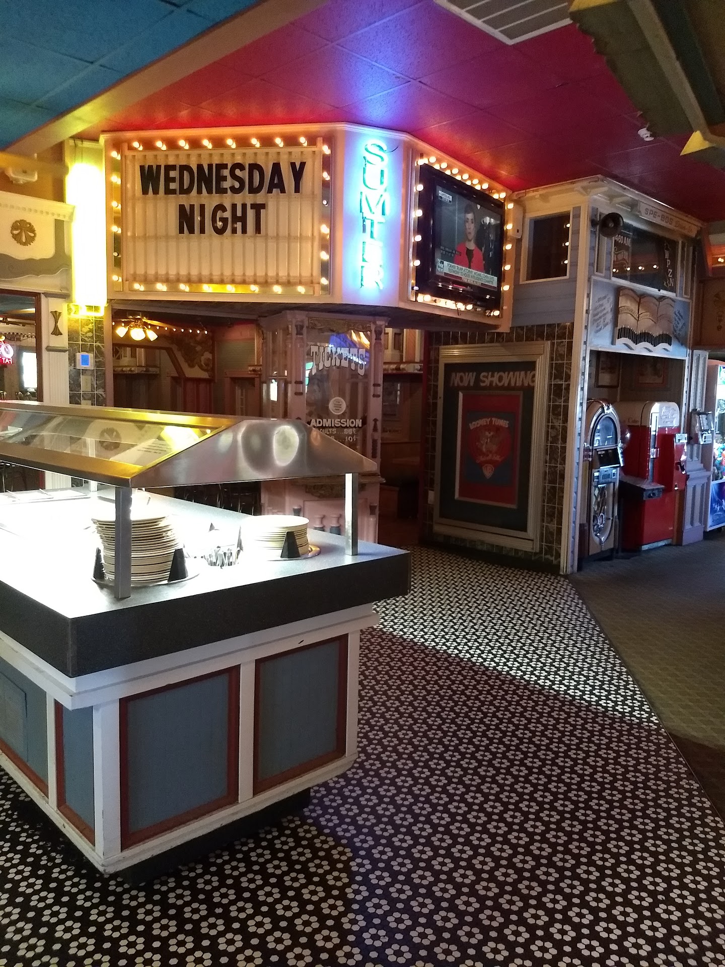 Classic arcade games, pinball, wood paneling out of the wild west/Mississippi River steamboat era, Looney toons on the TV, and a huge marquee with lettering straight out of a small town movie theater. Each room offers it's own unique charms. There is no place I've ever been quite like it, and if you are ever in Sumter, you should make every effort to stop by. The staff are friendly, the food comes quick, and the price is right. Definitely a welcoming place for families as well. I hope that they are around for many...