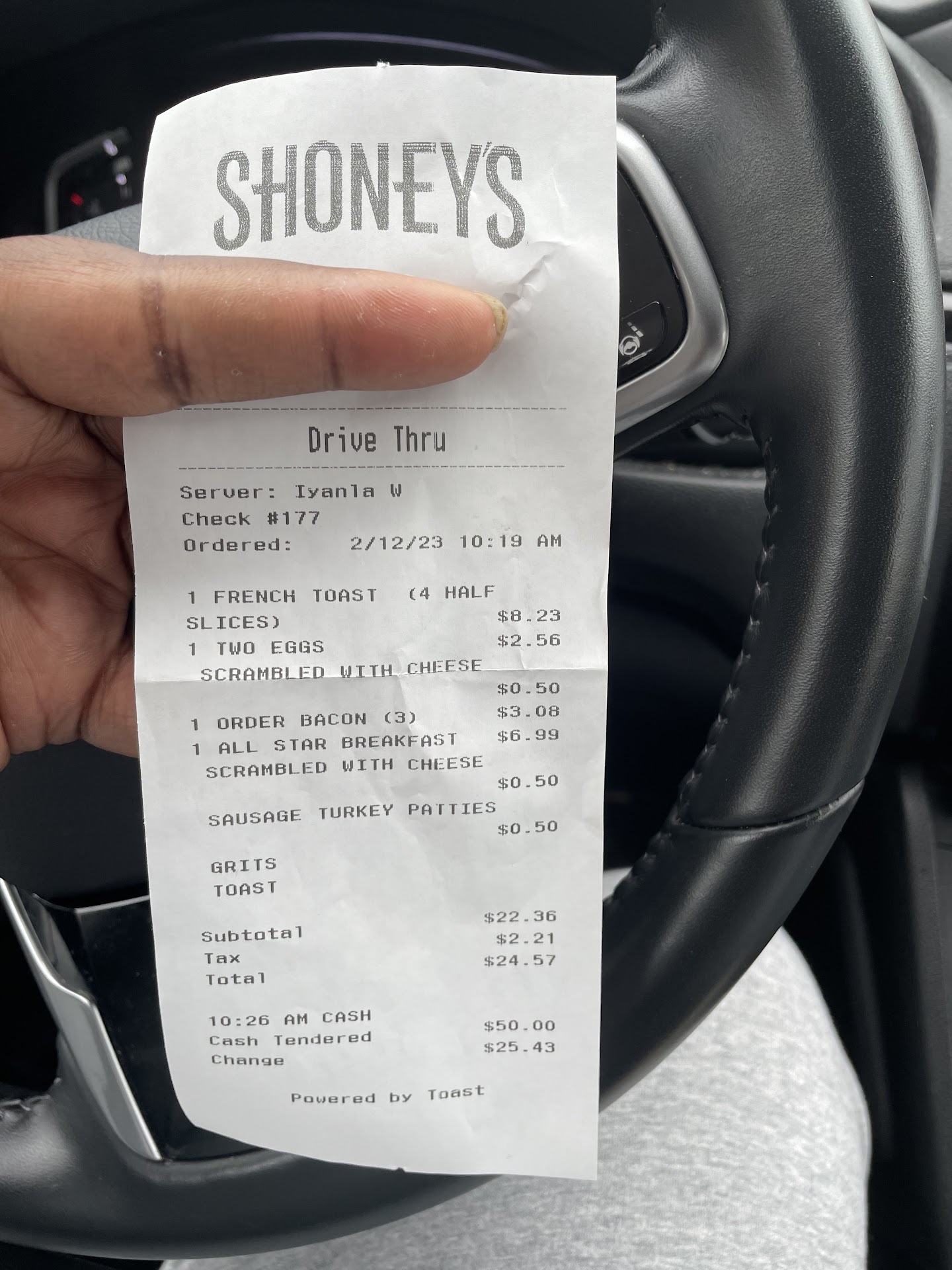 I've never felt so disrespected by an employee. The unethical acts were already being displayed but I overlooked it because they aren't on my level in society anyway. The question is do the servers of the bar own the restaurant or do they purchase the product for the restaurant from their own personal pockets??? Who pays shoney's bills? The employees or the owners??? Or is the managers in charge for the running or upkeep of the business personal affairs in the long-term success of the restaurant on the left wing. I saw plenty of cross-contamintion going on but I held back because the state of society and I didn't want to make matters worse for those who's already experiencing poverty. But one thing I will not tolerate from a minority is disrespectful approaches and responses when I am spending government funds to support the cause. You have to be careful, how you entertain certain guest because I could be your payroll overseer. You don't control anything or anyone at shoney's but yourself, your behavior and your own actions under stress and pressure working at a lucrative business. If certain patrons presence offends you, then a public place of work isn't a good place for you. A fool can cost a successful business millions for malpractice. Get it together...cause we don't like whistle blowers, do we??? So I would suggest calling a meeting with the employees that works the floor 😞 ...and every now and then do a wellness check ✅...if they are feeling overwhelmed, send them on a brief break to exhale, breathe, reset and refocus. That's how you show love and compassion for the lessser, meaning inexperienced in...