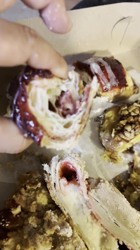 The pastries were dry and stale, the chocolate fillings were really hard and it was something we couldnât get through. The fillings inside all of the pastries were hard and ICE COLD. The pastries tasted as if they may have been frozen. The pastries werenât light, fluffy, and buttery as a pastry should be. The pastry was dry, stale, and slightly chewy. We didnât even taste some of the other pastries after trying a couple of the others. The textures were off. I did try to warm one up to see if it helped, but it was not good. The pastry just became more chewy and the filling was still cold and hard inside. It was just weird.
