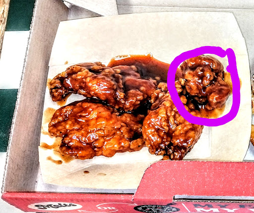 Update Feb. 12, 2025 Got a "My Hut Box" again, but had to drop it some stars since the previous visit. The wings were once again inconsistent in size with 2 tiny nuggets and the other 2 not close to the pictures. When I asked about them, I was told the suppliers are not always the same and that surprised me since chains should have a consistent product coming close to what is being advertised. The other star loss is due to the long black hair in my pizza, so they really need to watch their sanitary conditions and up their game--they lost a star in food and service for the hair, and maybe I should have dropped it more than that since it made my tummy a little flippy after having to pull the hair and dough outta my mouth. Also, this was the first time I ordered online and it did not go smoothly. A quick phone call would've been much more effective and not wasted so much of my time. Previous review: "My Hut Box" included a personal pan pizza with 2 toppings and 4 Wing Street wings. I was surprised the pizza wasn't greasy and at how tasty it was. I ordered the wings with barbecue sauce and they were lip smacking with a nice crisp skin before the sauce was applied. I thought the price was fair (bec. of the coupon) and I was pleased with the flavors, but disappointed that one wing out of the four was nothing more than some tiny part of a wing (see circled piece in picture) so they need to up the quality control and customers should check the box before leaving lest they be disappointed like I was! It's nice they have a few tables available for dine in but it's definitely meant to be a pick up and go place since other than the cheery mural, there certainly is...