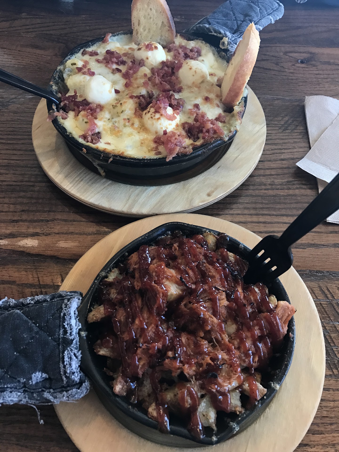 The mac and cheese dishes come in individual-sized cast iron skillets with two serving sizes: regular (about 6 inches in diameter) and Mac Daddy (about 9 inches in diameter). The skillet is a great serving vessel for this meal, as some of the cheese bakes onto the sides, creating a delicious crunchy foil to the sinfully creamy interior. The only drawback is that is near impossible to scrape the baked-on cheese off, since the flimsy black plastic fork that comes with the meal is no match for that tasty baked-on crust.
