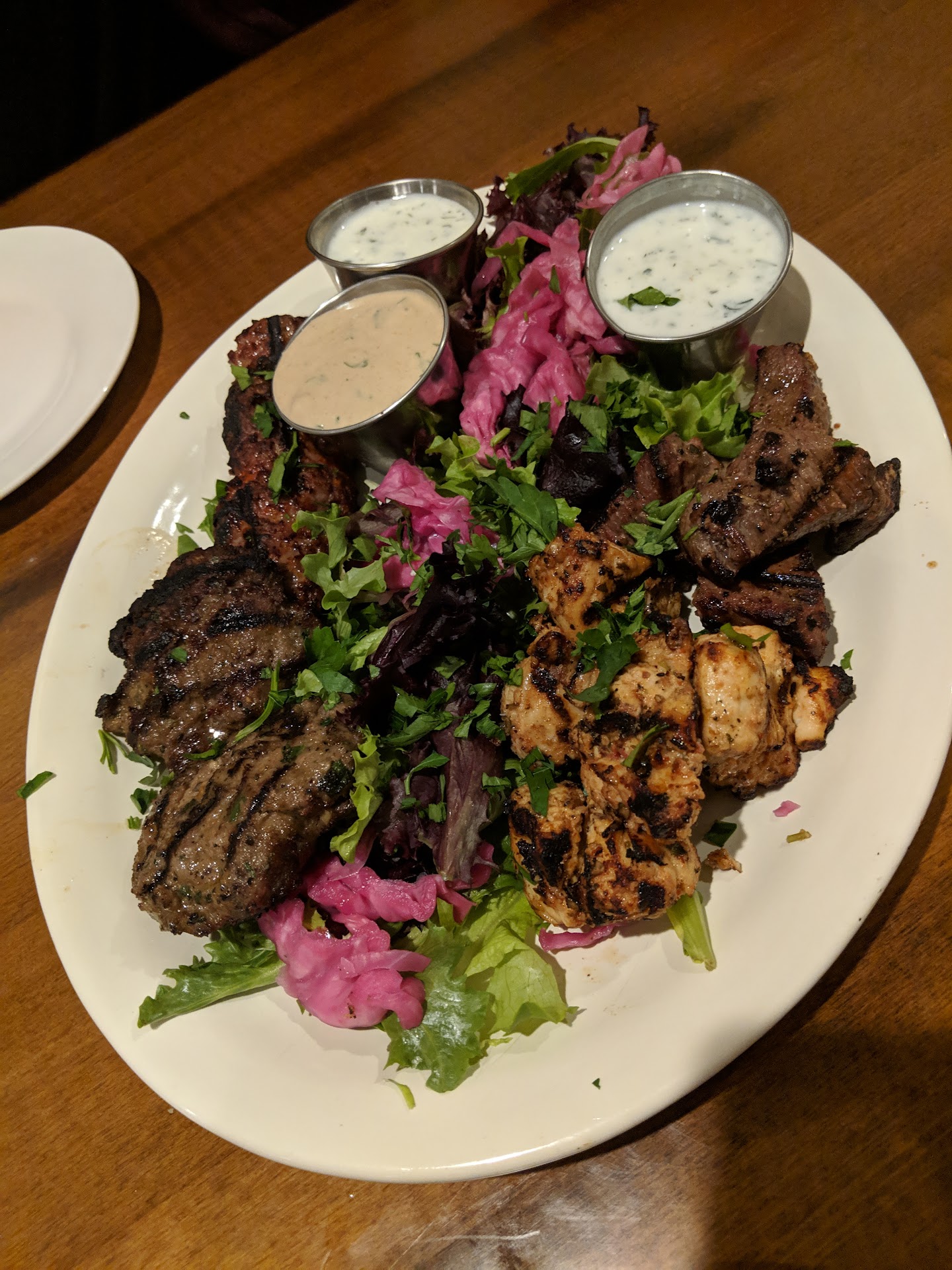 When I explained the issue, I was told the kebab looked that way because of the onions used in the recipe. I pointed out that the chicken and other meats on the platter appeared to be cooked at a glance, so I didnāt understand why the kebab looked so different. I asked what type of onions were used, but the waiter said he didnāt knowāonly that this is what the owner had told him.