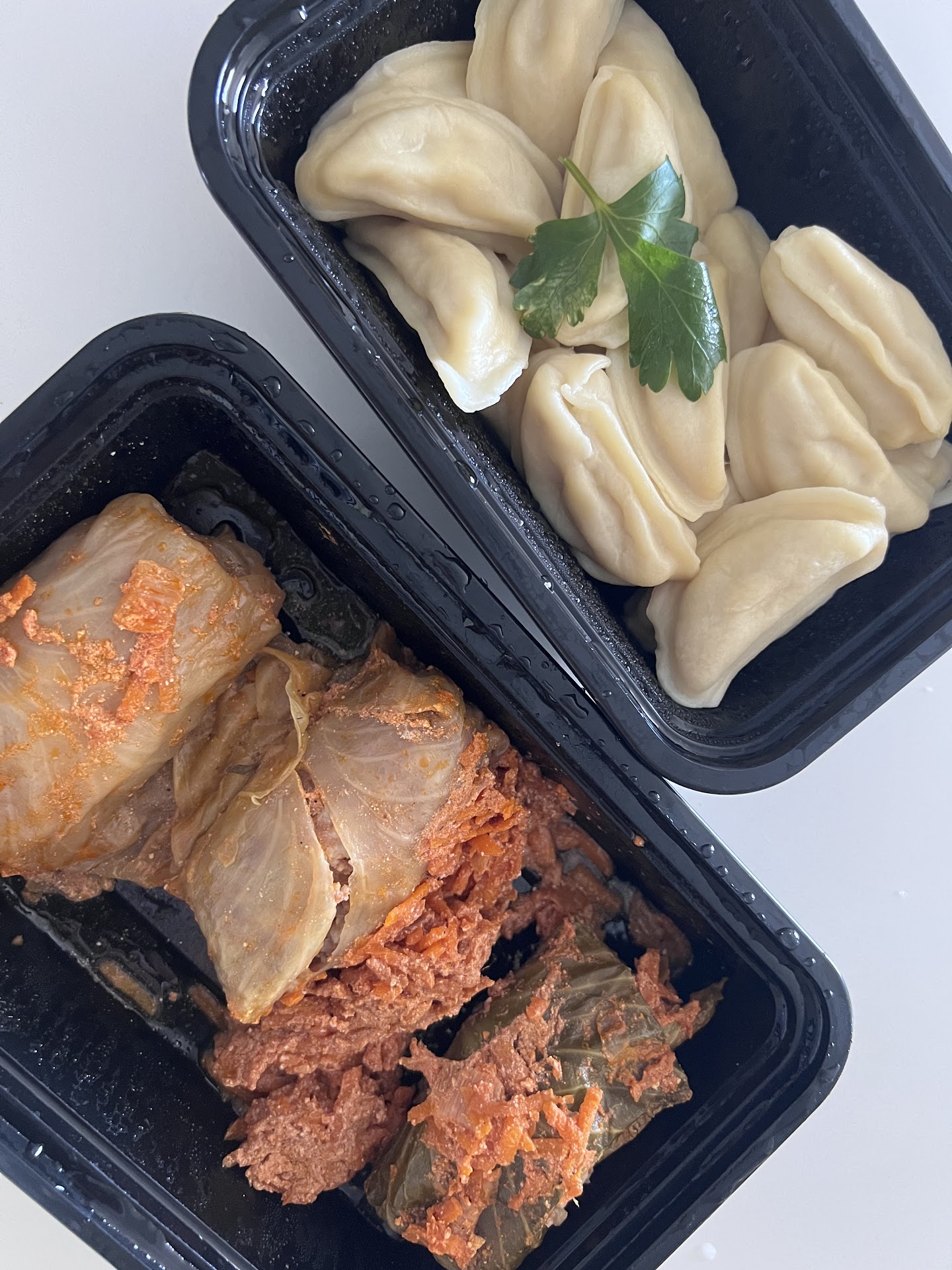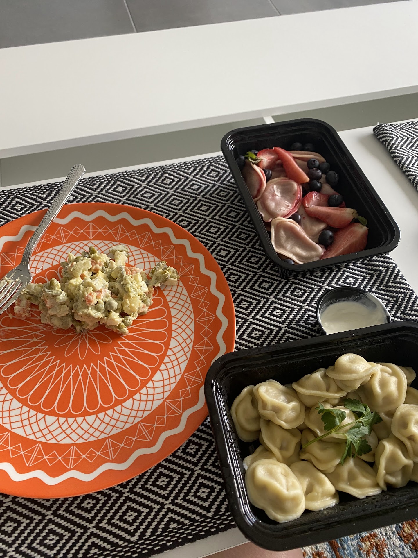 Saw their ad on Instagram and decided to try out. I ordered khinkali, vareniki with cherries and olivier salad. All these dishes are familiar to me cause I am Ukrainian, so I knew what I ordered.