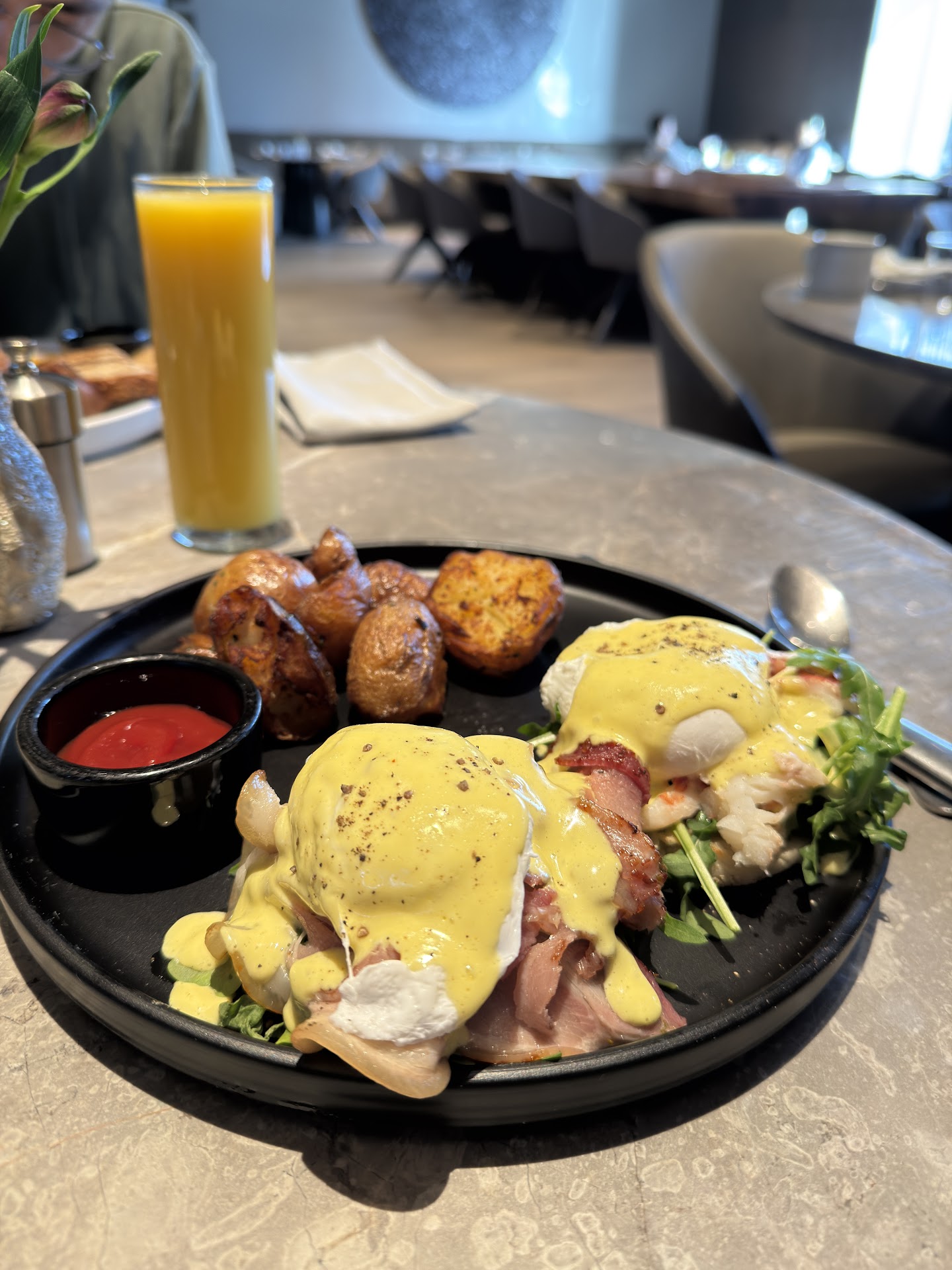 We ordered the Lobster Benedict — only to receive one with lobster, and the other with bacon. Not only was I never informed of this switch, but there was no mention of it on the menu either. I don’t eat bacon, and I never would have ordered it had I known. This felt misleading at best — and borderline deceptive. I chose not to make a scene, but the bacon was overpoweringly gamey and completely ruined the meal for me.