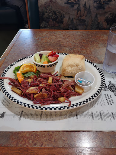 The interior is a contemporary diner table and booth setup with a Black Bear ambiance. Lots of Black Bear statues which kids might enjoy and a Black Bear newspaper with the menu concealed in the inside pages. I ordered the Corned Beef Hash without eggs, fruit and a biscuit. After a short wait my meal was brought to me and the quantities were huge. The CBH was unique with large shreds of meat and cubed potatoes. Service was good throughout my stay.