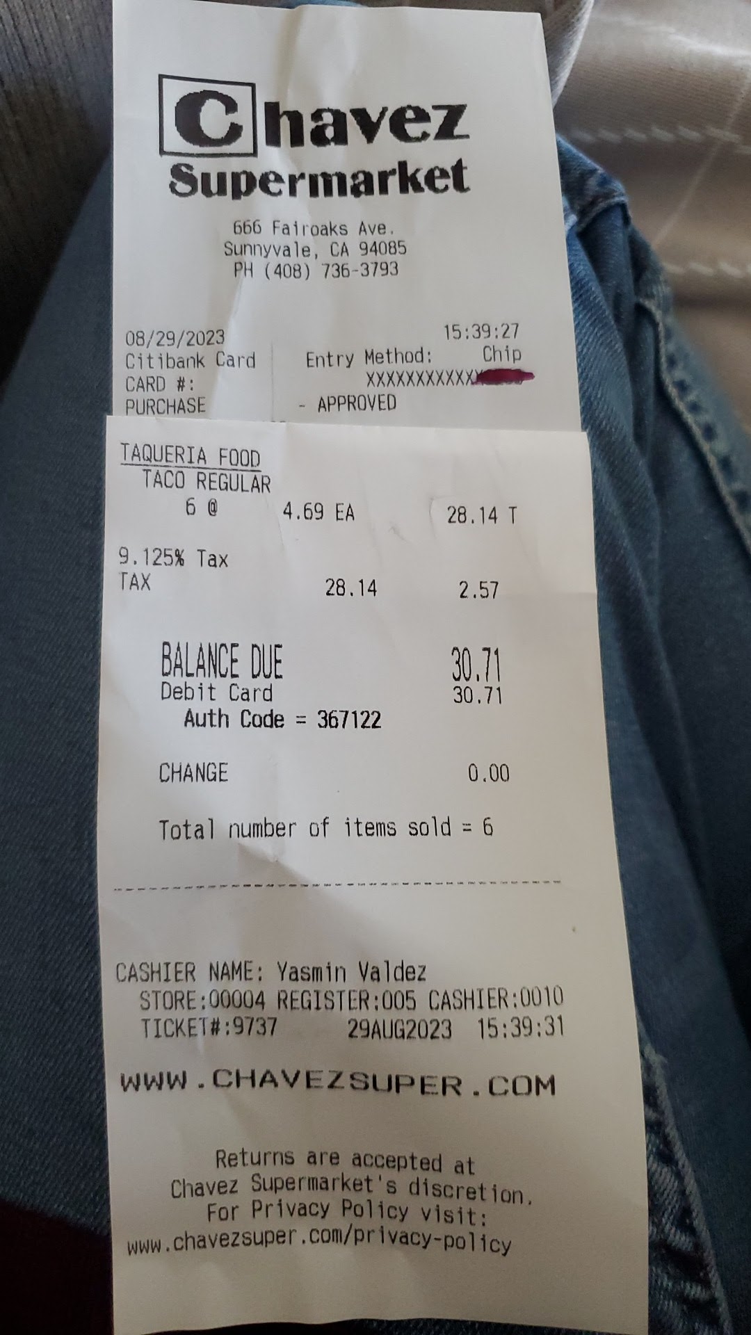 Read moreI like chaves market good quality ingredients tasty hot food I've only been to the location in redwood City never to the one in Sunnyvale but pretty much the same thing extremely small parking lot supermarket full of good stuff they were six cashier lines and only one was open 2:30 in the afternoon on a very busy Street I got a burrito in the back and I wanted to purchase my drink there too but I wasn't allowed to that doesn't make any sense but trying to divert the flow of people at the taqueria coming to the front of the store but there's no point when there's that many cashier open and nobody's there to do it I left my drink because the line had more than 20 people and by the time I pay for my drink my burrito would be freezing cold that's why I gave it a two star I thought that was pretty ridiculous I did see it for higher sign it said starting at $22 an hour which is not bad for a supermarket I used to work for whole foods and they start you at 17 what a difference anyways I just want to write this review because I couldn't believe how long the lines were and there are so many employees in the back but nobody could jump on a cashier talk about no team effort thanks for taking the time to read...