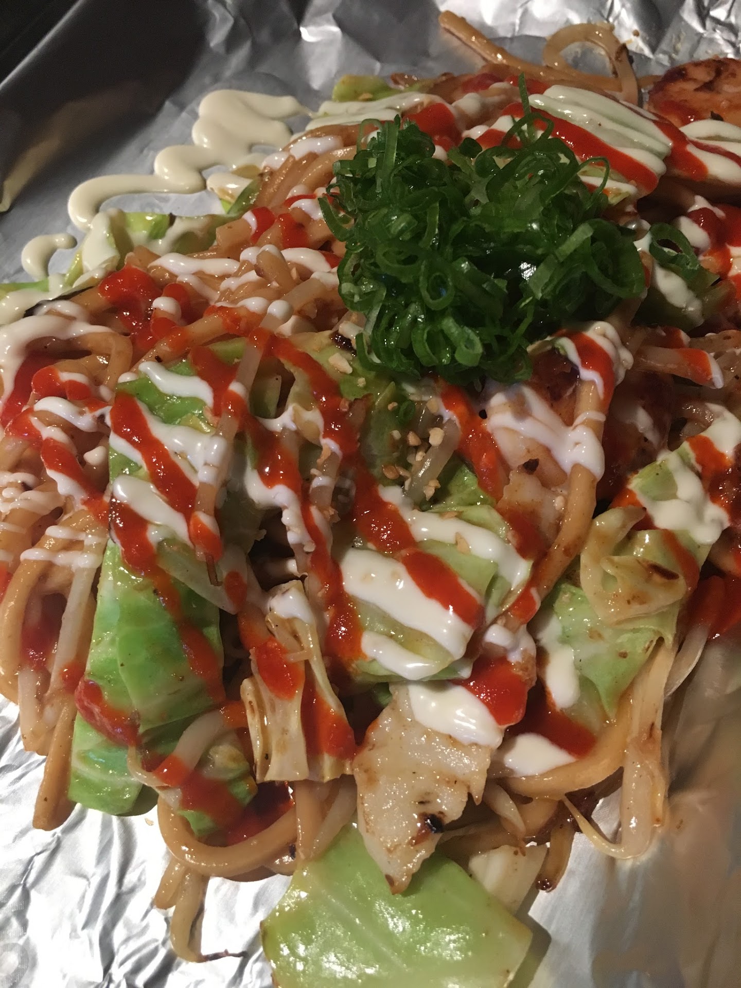 First some education! Okonomiyaki is a grilled Japanese pancake with flour, egg, shredded cabbage and meat topped with a bunch of sauce (Japanese mayo, etc.) Technically you can put anything you like in it. Yakisoba is grilled soba noodle. Modanyaki is okonomiyaki with soba noodle.