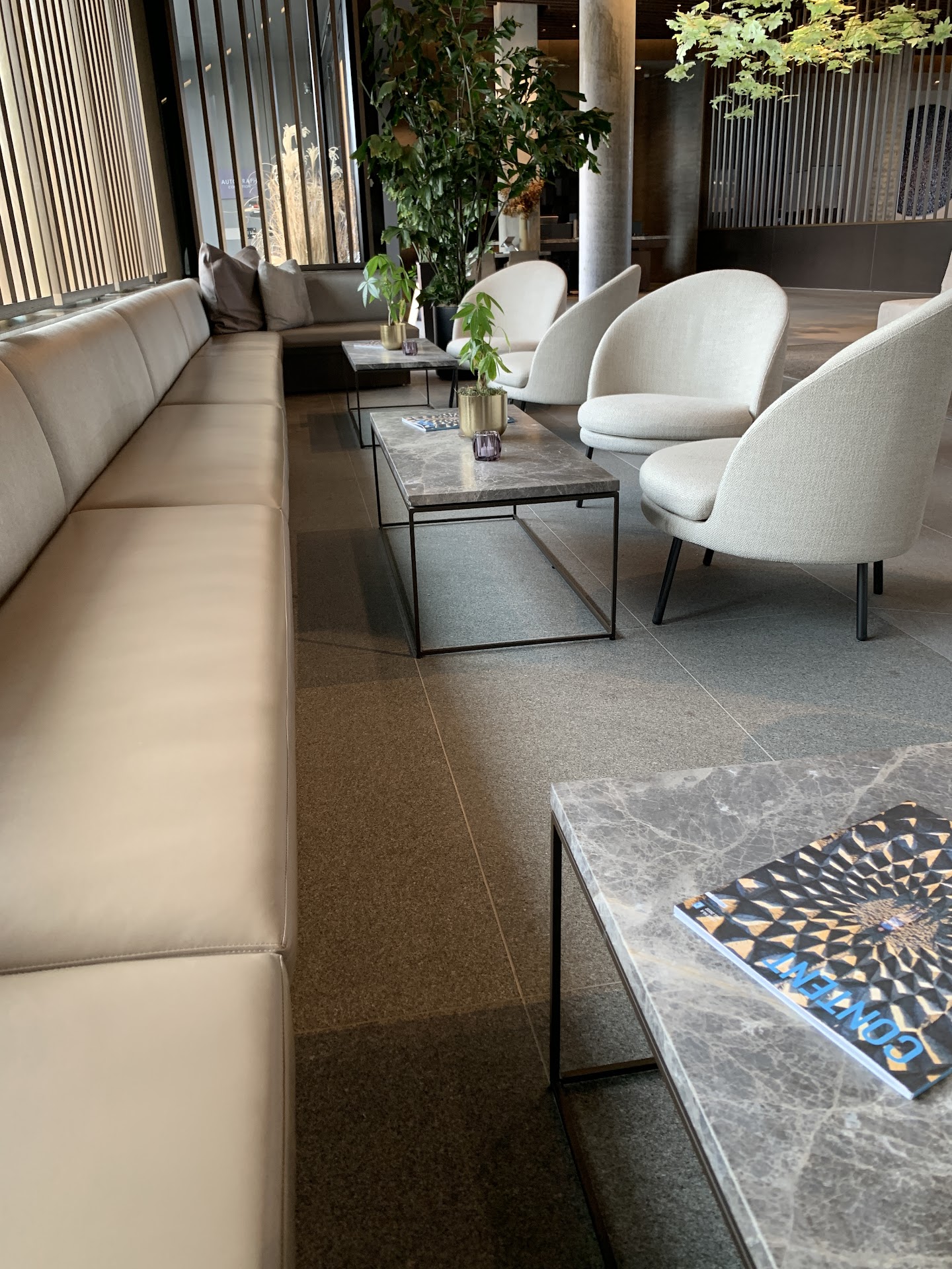 The lobby space is large with lots of seating options and both wall and floor plugs. If you want a laptop height table, you’ll be sitting at one of two communal tables on stools. All of the other tables are too low to work at. The hotel internet tested around 19 Mbps and was plenty fast for video conferencing. Bathrooms are located behind the restaurant, very nice and clean.