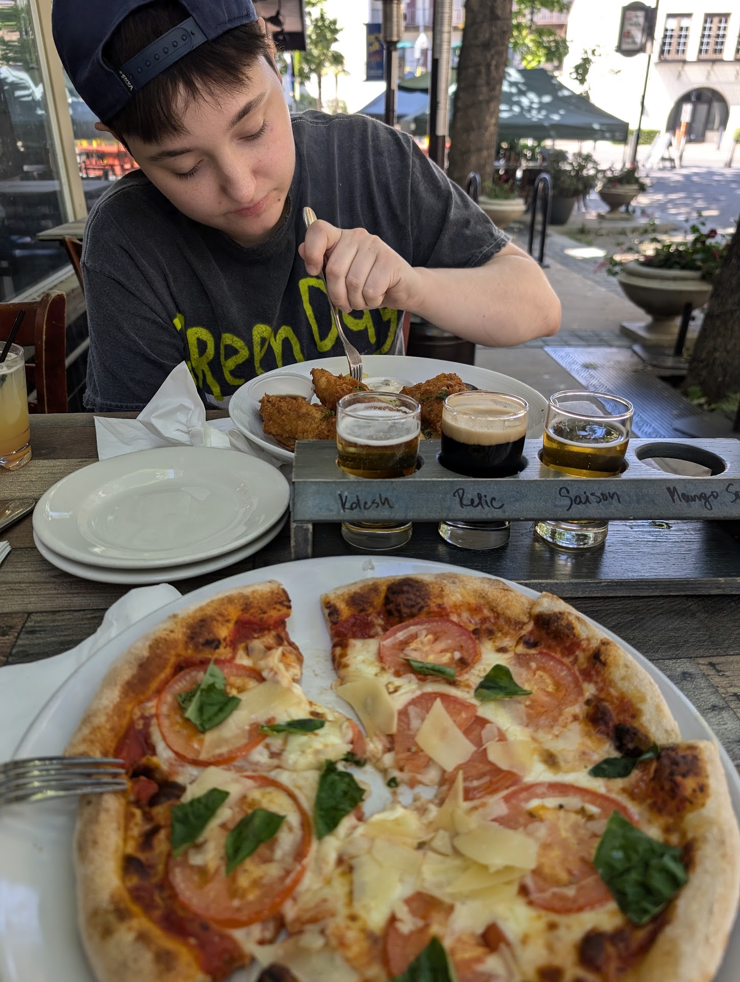 I was in San Jose for the weekend and this is the second place I went. Got a flight of beer because that's the easiest thing to do flight came right away I had the coach the Stout they siason and the sour and out of all of them all the sour was drinkable. The coach had an overpowering bitter back bite and was too sweet after the bitterness cleared. The sea salt was pretty much the same a little bit of funk came through in the nose smell good took a sip and just bitter like bitter chemical bitterness. Try the Stout, nice sweet chocolatey nose take a sip of sweetness , bitter bitter undrinkably bitter and thin . The mango sour was the best of the bunch nice mango, crisp clean not too sweet not too sour, great summer beer for an evening sitting out on the patio. Friend had the fish and chips not bad, individually battered fish sticks good fries french . I had the margarita Stone fired pie and they must not have had the oven quite hot enough because there was no leopard spotting and the crust was under done for a wood fired pie. Now the pizza itself was delicious lots of motz, the sauce had a nice umami to it , anchovy I suspect but it really set the pie off, just enough basil ,very tasty . Service was good but on a Sunday there was not many ppl here. Unfortunately the food was not good enough to make it a place you would want to go considering the beer was unfortunately so bad. This isn't an individual taste thing, I know a thing or...