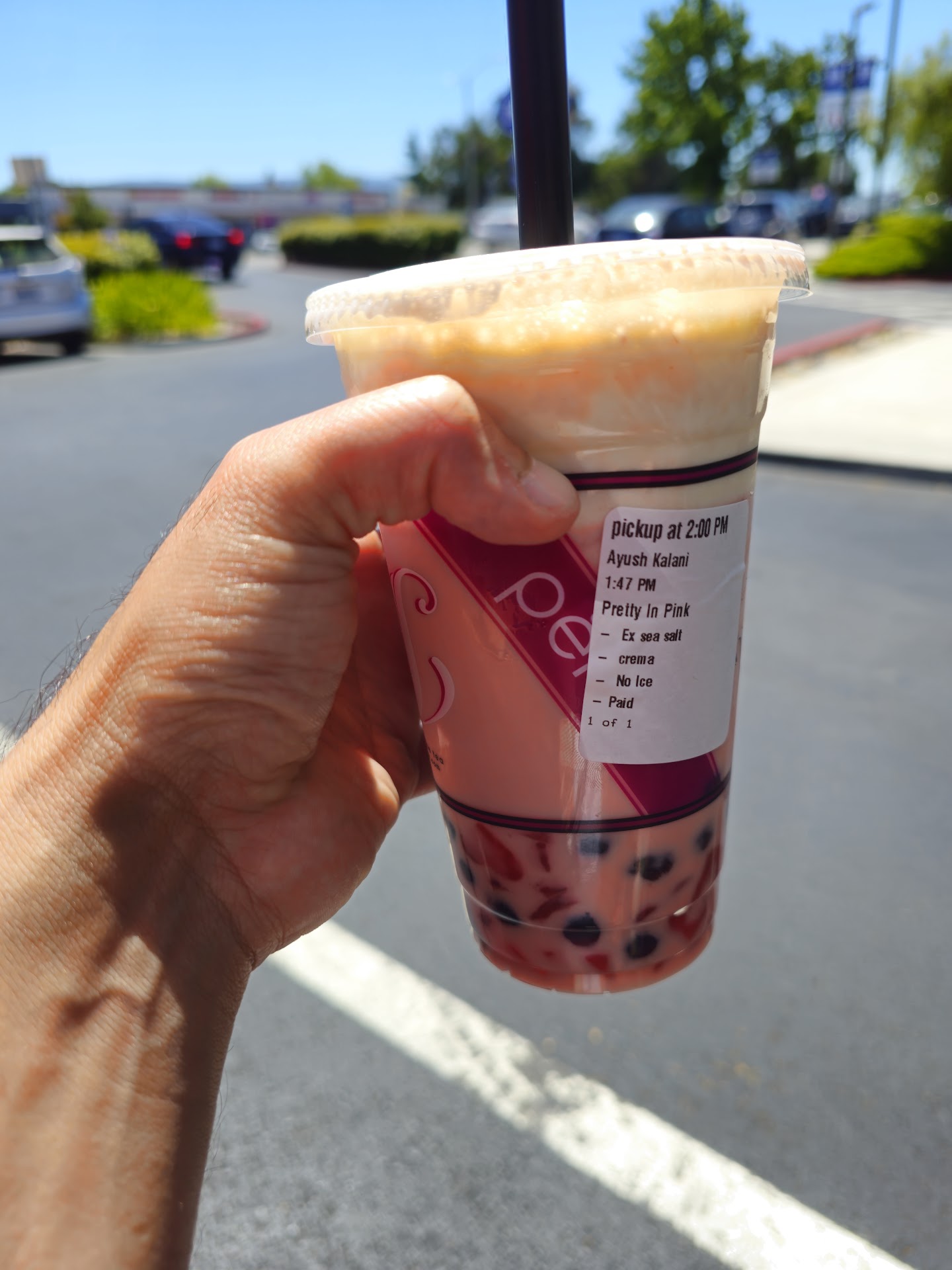 Speaking of the order, I went for the "Pretty in Pink" milk tea with sea salt cream and strawberry chunks. The drink was functionally flawed. The cup overflowed, dripping down the sides. A quick wipe from the staff would have been nice.