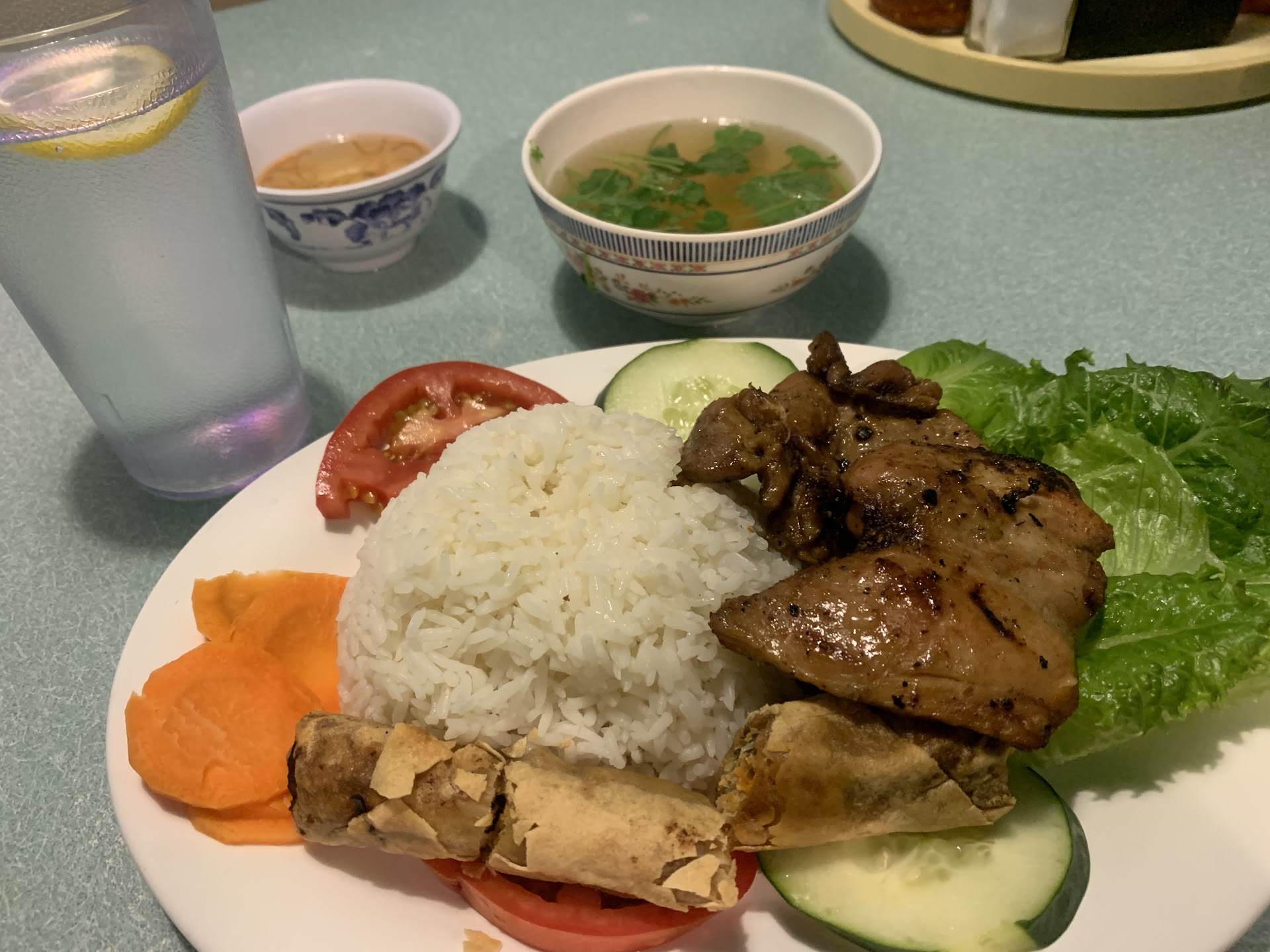 Dinner order tonight: Vegetable Pho (sml) - 5 out of 5 Grilled chicken rice place with egg roll - (4 out of 5) Could have added a little more chicken