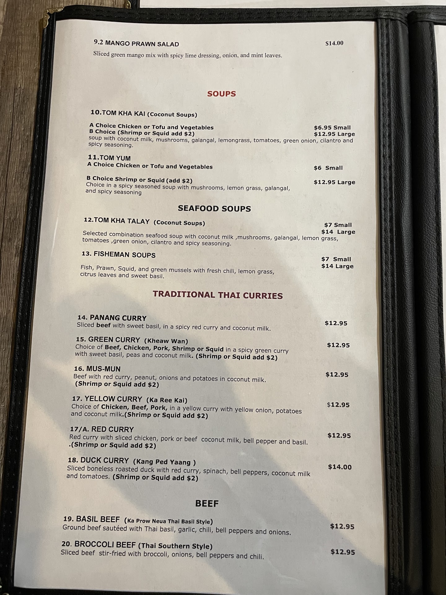 Thai Iced Tea wasnt the usual. We had to ask for more cream. Otherwise it tasted like a watered down Tahi iced tea. The dishes are totally out dated there. I saw plates that I use to see at buffets over 20 - 25 years ago.