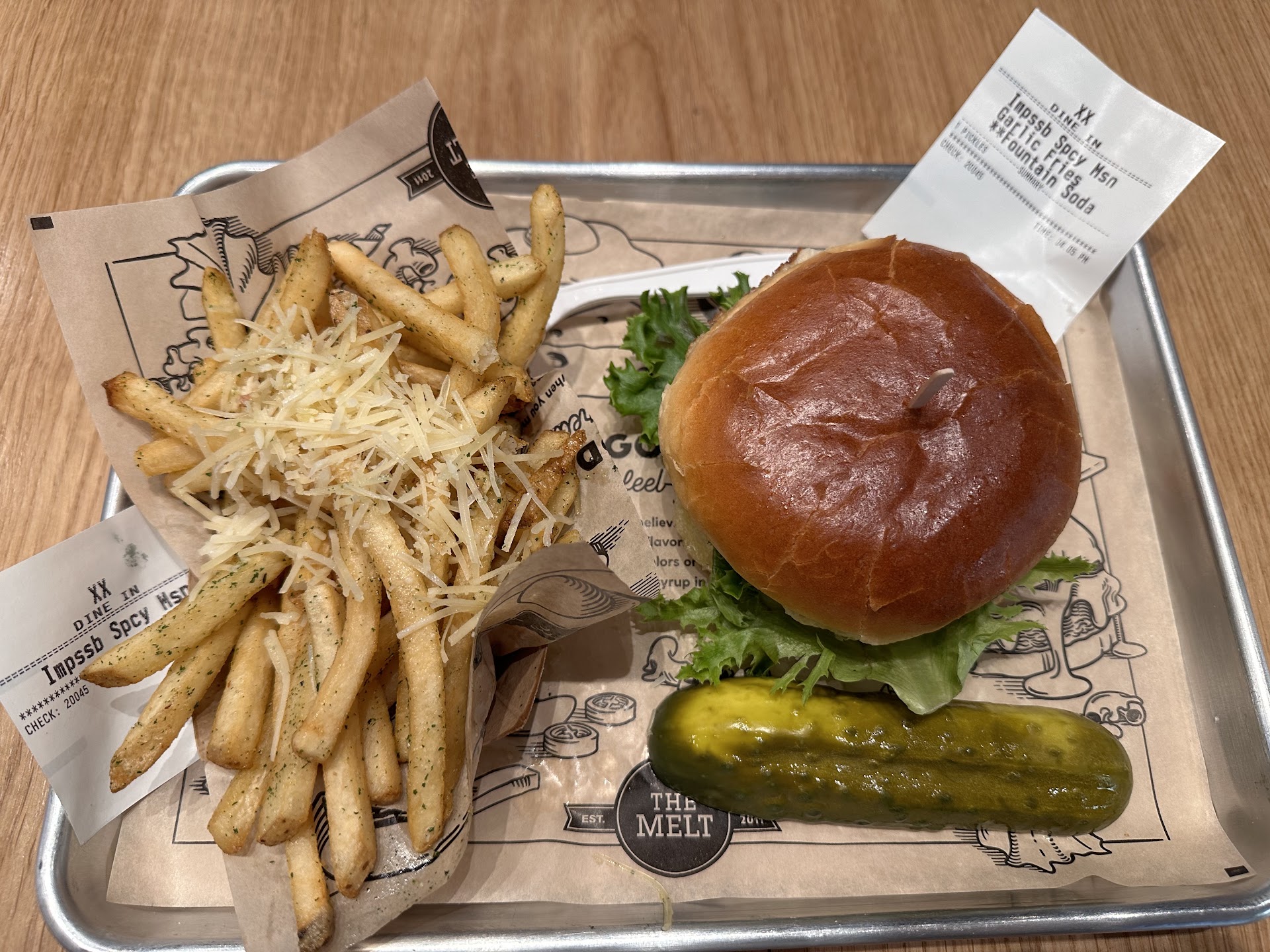 When I asked the server for recommendations, he wasn’t able to narrow it down, simply saying “everything is good.” So, I went with the Impossible Spicy Mission Burger, garlic parmesan fries, and a soda.