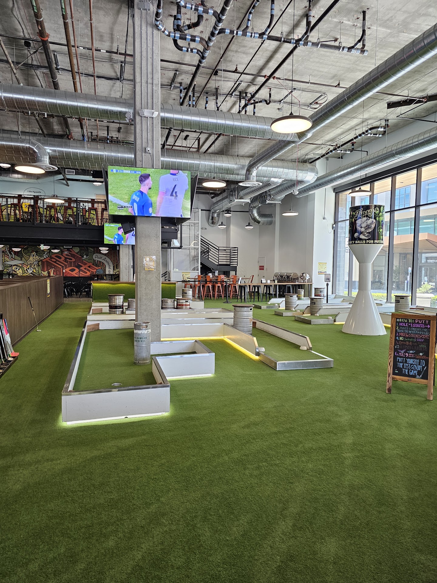 Seating and Set-up: The venue offers both indoor and outdoor seating. Inside, the mini golf (putt-putt) is on the right, and there's a table golf area on the left.