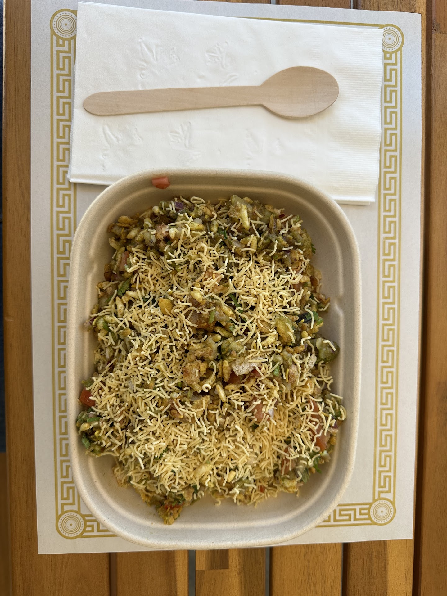 Read moreBhel Puri Quick and fresh! It's not overly spicy, but still good. If you don't like spicy, I'd suggest asking them to reduce it little. There was no hard papadi, only crushed up pani puri shells, which was perfectly good. In my perspective, eating with a flat wooden spoon was a little annoying, but it did the job.