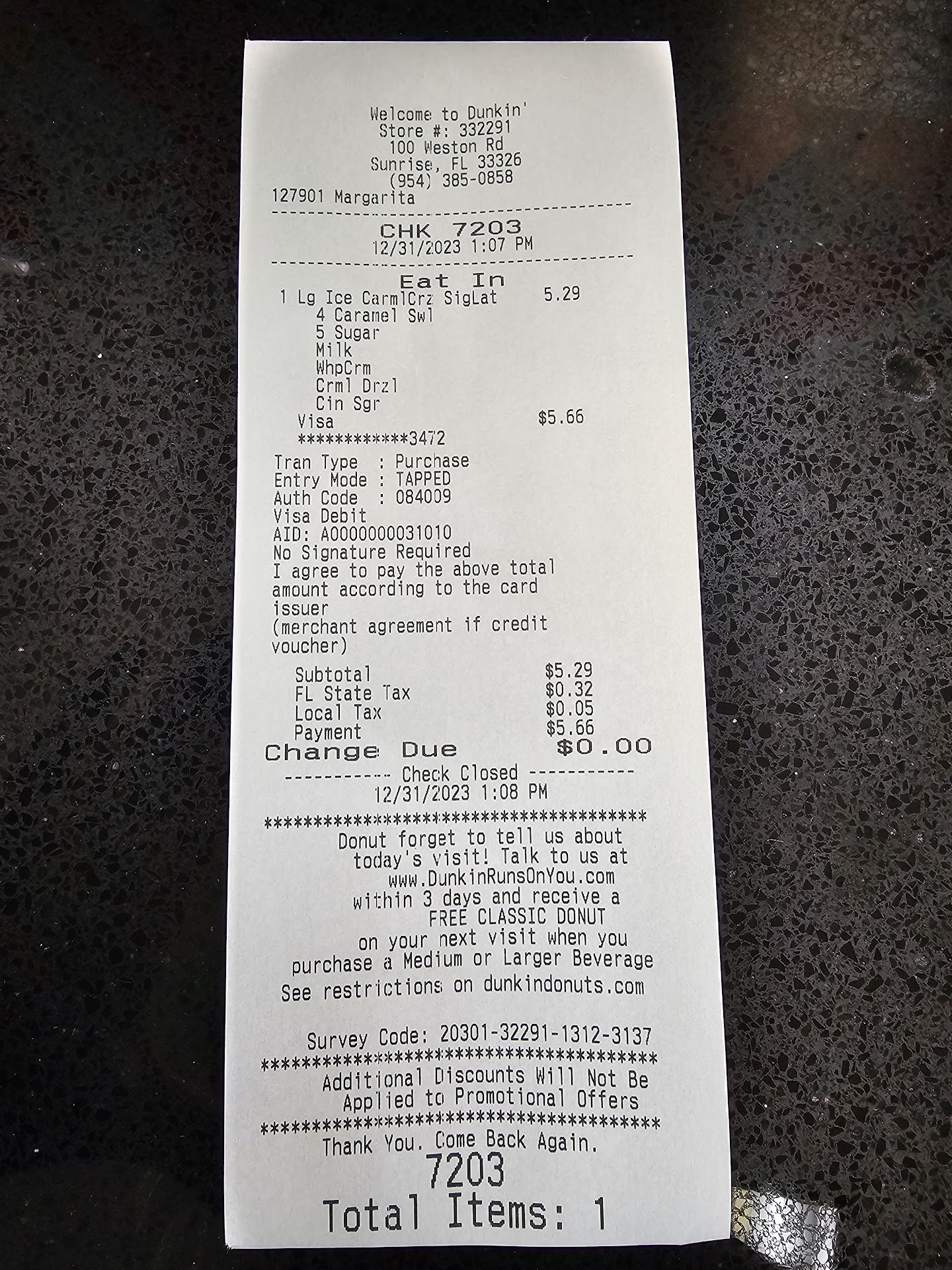 Read moreI had a great experience here. Friendly staff and clientele. I came in the afternoon on a hot day and ordered the Pineapple Mango Refresher. It was made quickly, too. Let me tell you, it was very delicious and just what I needed for a hot summer afternoon in South Florida. $4.29 before tax and it was served in a big cup. My kid ordered a donut and an iced decaf coffee. Both came out exceptionally well. The staff was nice and accommodating, and the clientele were nice people all-around. They had some new and unique flavors for iced coffees too, which I'm eager to try out. All in all, I would absolutely return and recommend to others. Thank...